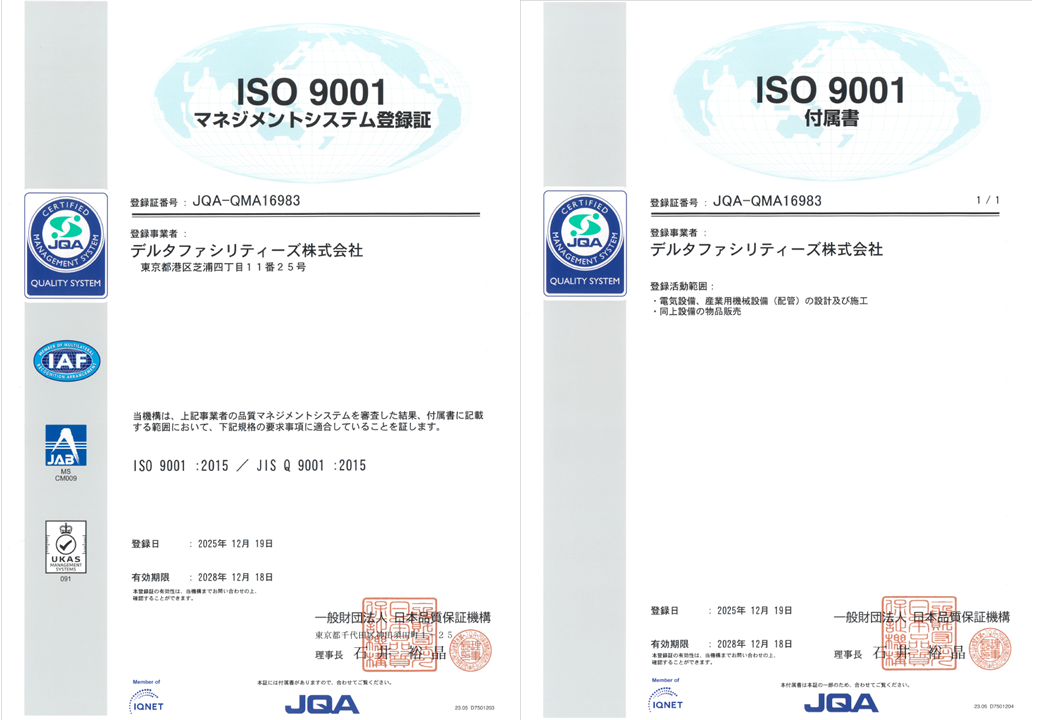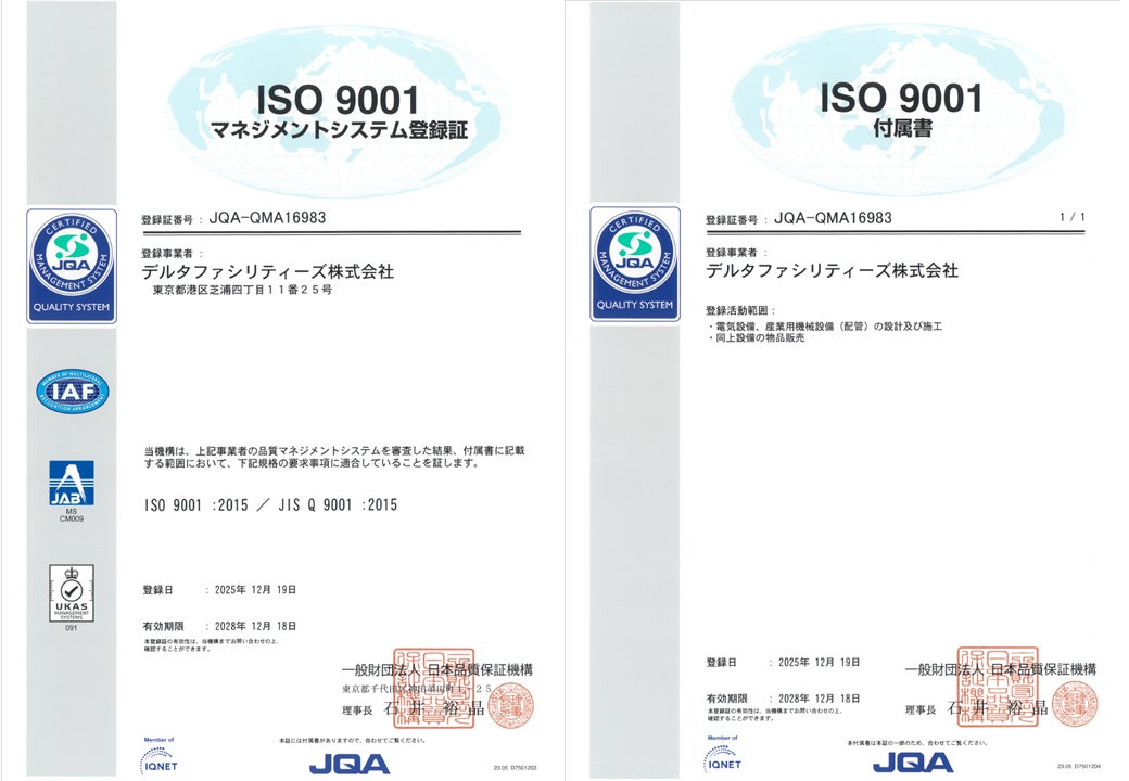 デルタ電子株式会社(本社:東京都港区、代表者:華 健豪)の子会社で、建設業を営むデルタファシリティーズ株式会社(本社:東京都港区、以下「当社」)は、このたび、品質マネジメントシステムに関する国際規格 ISO 9001(ISO 9001:2015) の認証を、一般財団法人日本品質保証機構(JQA)より取得いたしましたので、お知らせいたします。