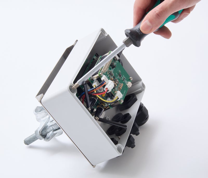「Pi-field」は、電源やネットワークがない屋外でも「ラズベリーパイ」を使用した環境モニタリングを実現する、当社開発の屋外稼働キットです。4G通信モジュール、太陽光パネル等の部材を防水ボックスに配置し、間欠動作を採用することでシステム全体の小型・軽量化を実現しており、2017年2月の出荷以来、自治体での河川監視など、多くの稼働実績を有しています。