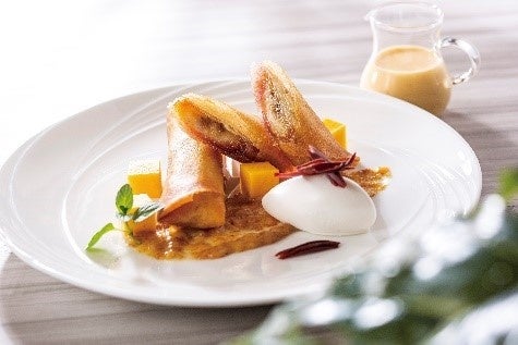 日本で流通しているバナナの7~8割はフィリピン産。トロピカルフルーツ王国のフィリピンでも人気なのが、バナナの春巻き“トゥロン”です。バナナと紫イモのジャムを薄い皮で巻いて揚げ、ココナッツのムースとバナナのソース、マンゴーを添え、シェイブしたフィリピンチョコレートをのせた温かいデザートです。お好みで別添えのアングレーズソース(卵黄と牛乳を使ったデザートソース)とともにお召し上がりください。