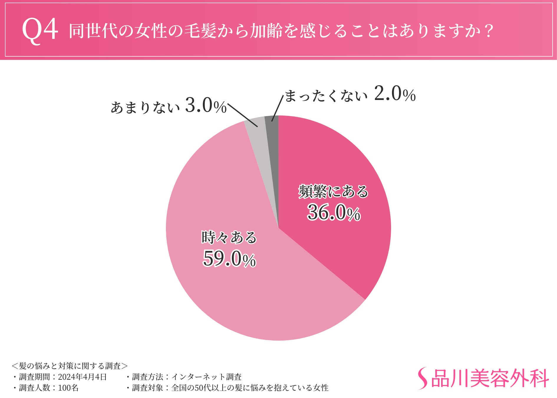同世代の女性の毛髪から加齢を感じることがあるか伺ったところ、「時々ある(59.0%)」「頻繁にある(36.0%)」という回答が集まりました。