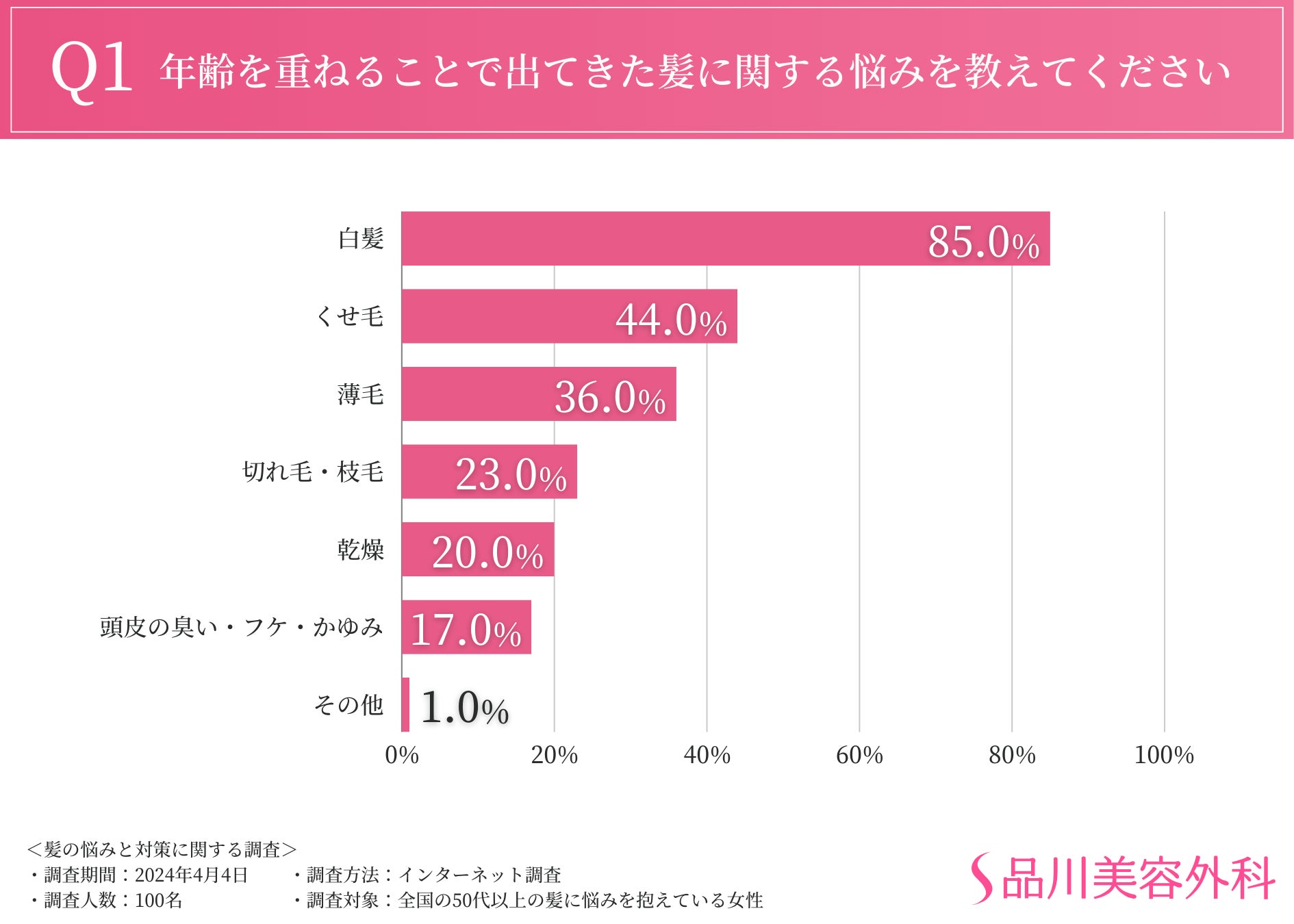 はじめに、年齢を重ねるごとに出てきた髪に関する悩みについて伺ったところ、「白髪(85.0%)」と回答した方が最も多い結果となりました。