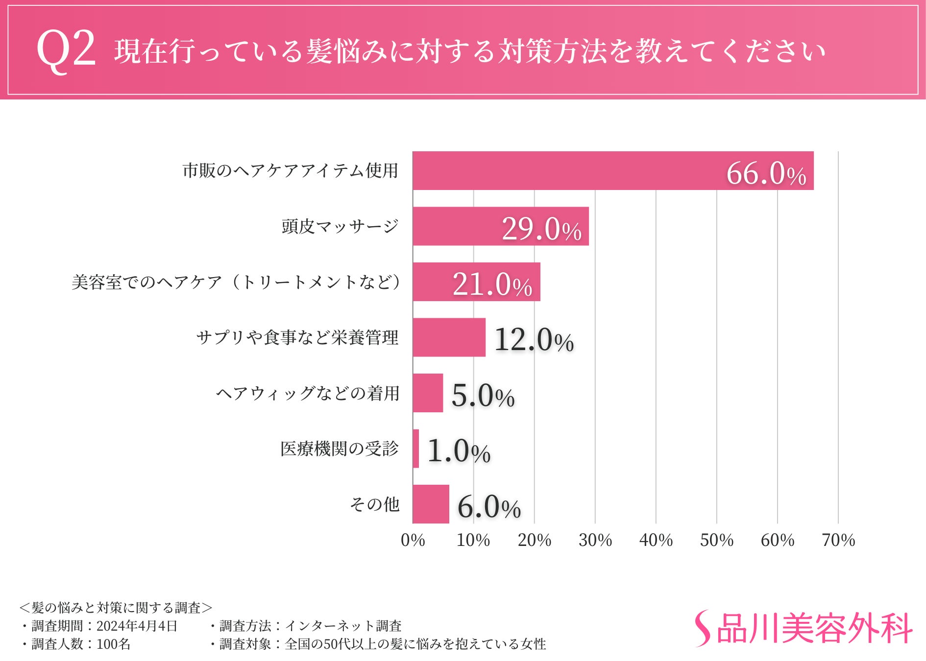 次に、現在行っている髪悩みに対する対策方法について伺ったところ、「市販のヘアケアアイテム使用(66.0%)」と回答した方が最も多い結果となりました。