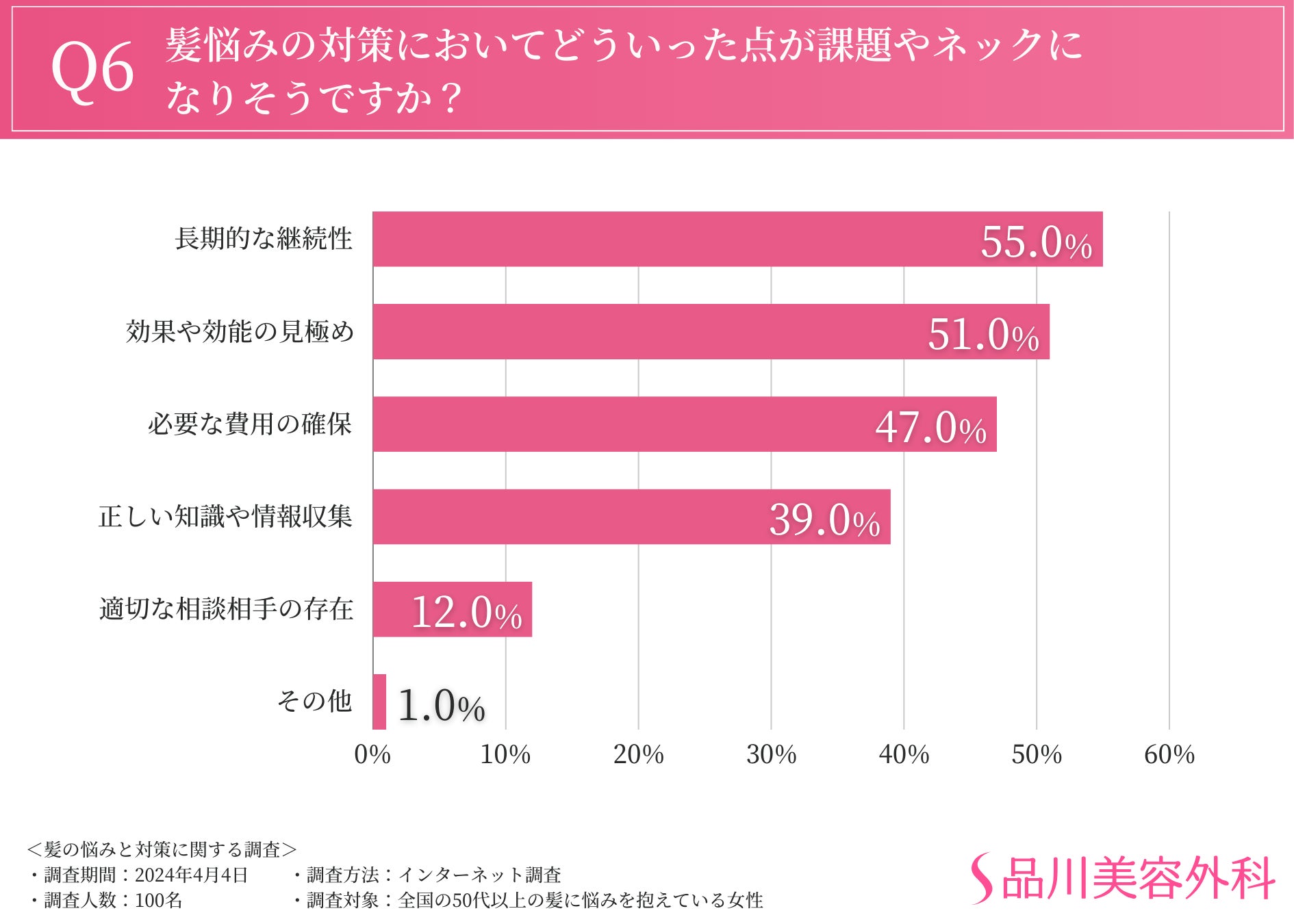 髪悩みはいち早く解決したいものですが、対策を行う上でどのような点が課題やネックになりそうなのか伺ったところ、「長期的な継続性(55.0%)」「効果や効能の見極め(51.0%)」「必要な費用の確保(47.0%)」という回答が集まりました。