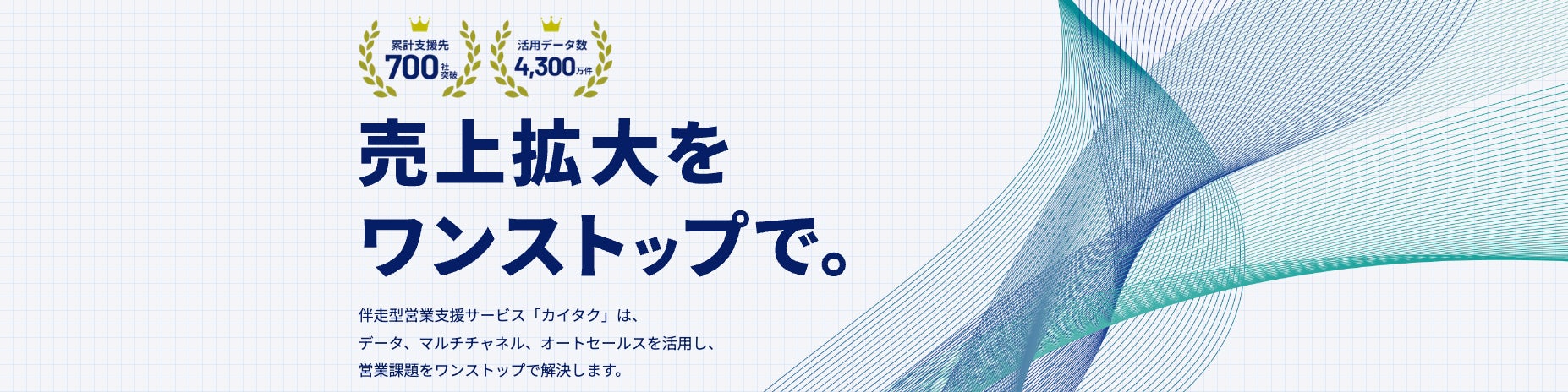 「よい商品に、もっとチャンスを」をコンセプトにした、法人向けの営業支援サービスです。マルチチャネルによるアプローチと、アクセス行動などをもとにした営業シグナルデータ、更にはAI活用型のオートセールス(自動営業システム)を活用し、営業のプロによる戦略立案から実働までをトータルで支援する、フルサポート伴走型のサービスです。継続的な仮説検証を通じて各企業・商材の「勝ちパターン」を探しながら、営業活動を成功へと導きます。