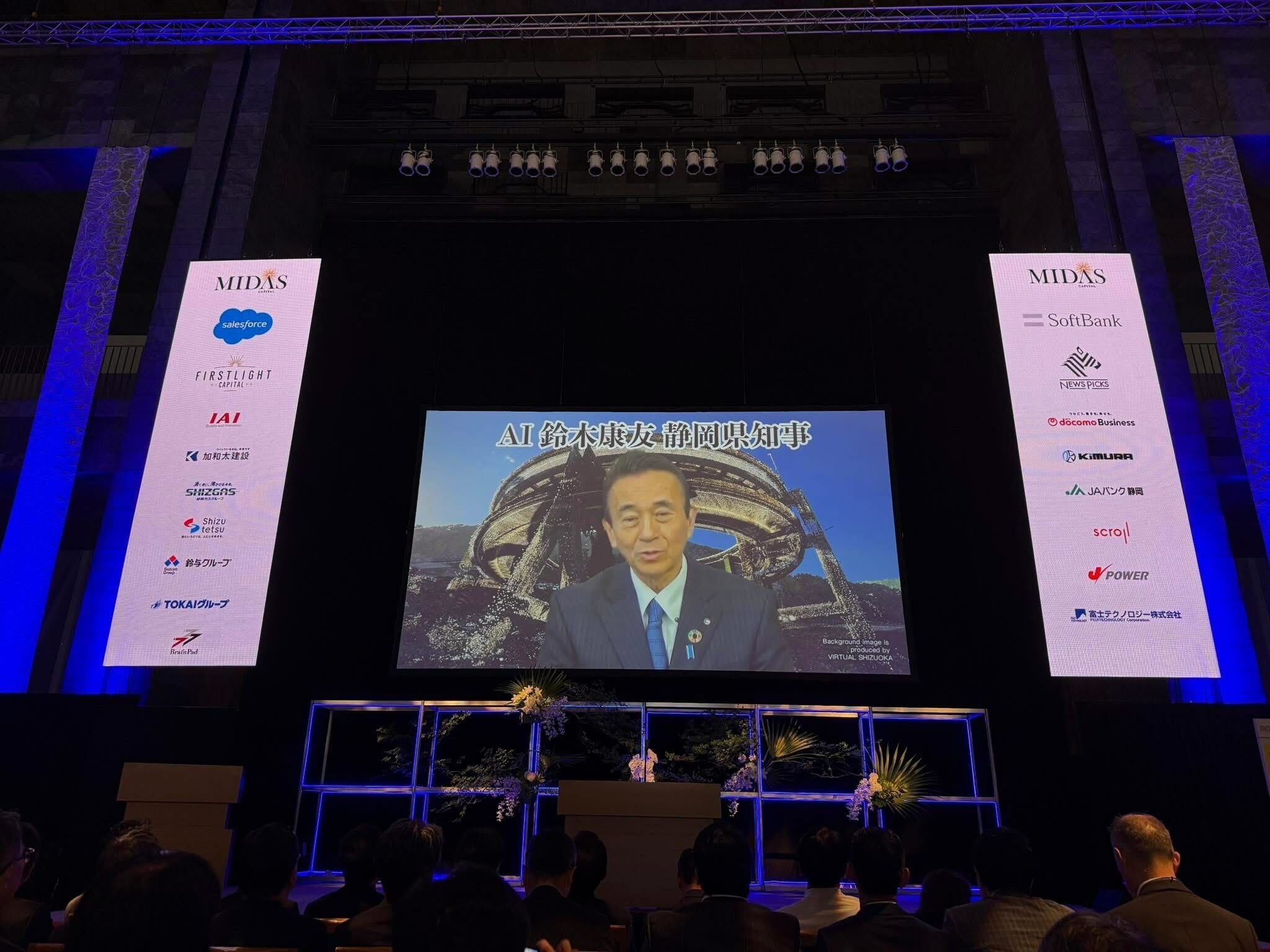 静岡県主催のテクノロジーイベント「TECH BEAT Shizuoka」(2025年7月24日開催)のオープニングで、DigiSelfで作成したAI鈴木康友県知事が登壇しました。自治体トップのAIアバターがイベント冒頭で挨拶を行うという先進的な演出で、来場者の注目を集めました。
