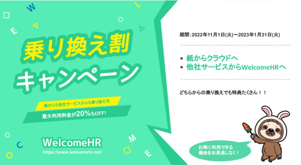 このような背景から、まだ入社手続きの電子化をされていない企業様や他社のクラウドをご利用されているお客様に向けて、クラウド労務管理サービス『WelcomeHR』期間限定の割引キャンペーンを実施いたします。