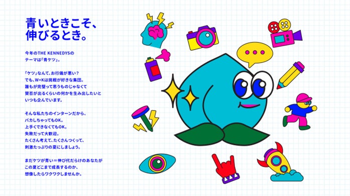 今年のTHE KENNEDYSのテーマは「青ケツ」。青いときこそ、伸びるとき。「ケツ」なんて、お行儀が悪い?でも、W+Kは挑戦が好きな集団。誰もが完璧って思うものじゃなくて賛否が出るくらいの何かを生み出したいといつも企んでいます。そんな私たちのインターンだから、バカしちゃってもOK。上手くできなくてもOK。失敗だって大歓迎。たくさん考えて、たくさんつくって、刺激たっぷりの夏にしましょう。まだケツが青い=伸び代だらけのあなたがこの夏どこまで成長するのか、想像したらワクワクしませんか。