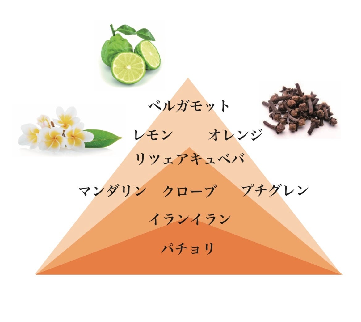 「ESCAPE(エスケープ)」と名付けられたこの香りは、ベルガモットの 柑橘系の香りに、フランジュパニやイランイランの華やかな 花々しさ、クローブやパチョリのスパイシーさを中心に調合。 爽やかさに深い甘みとエキゾチックさを掛け合わせた香りは、 あなたを現実から癒しの世界へみちびきます。