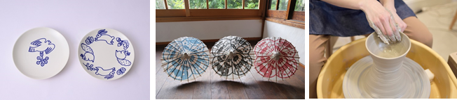 (写真:左から松尾ミユキさんオリジナルイラストの「美濃焼づくり」「まめ和傘作り」、「ろくろ体験」)