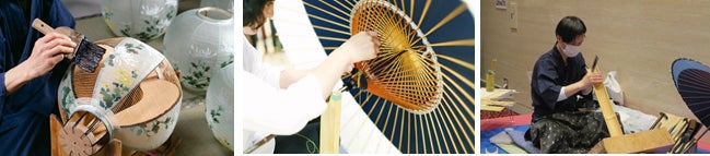 (写真:左から「岐阜提灯の張り」、「糸がかり」、「竹骨作り」の実演)