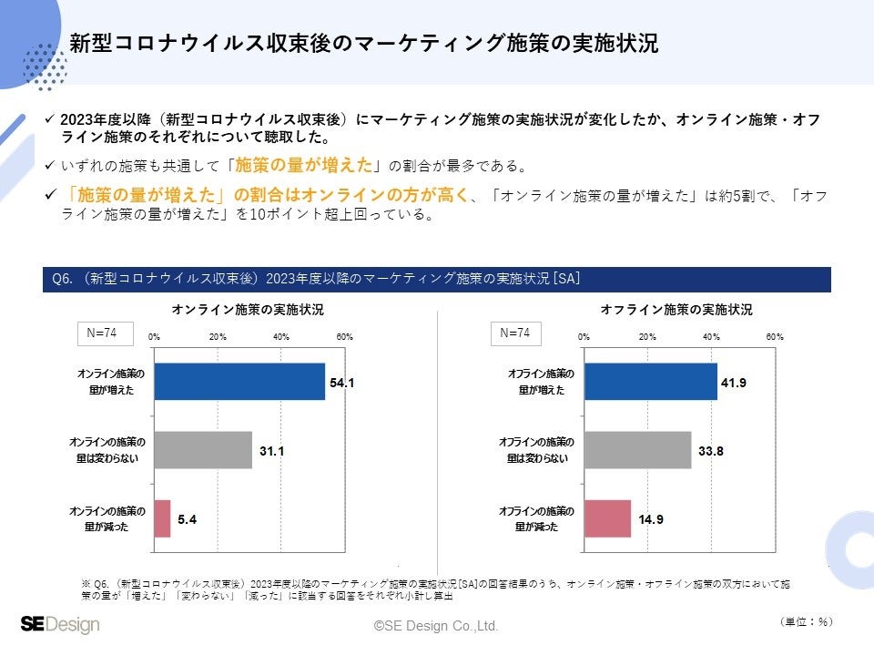 「Q6.(新型コロナウイルス収束後)2023年度以降のマーケティング施策の実施状況について、オンライン施策とオフライン施策の観点から教えてください。(単一回答)」(n=74)と質問したところ、オンラインは54.1%、オフラインは41.9%が「施策の量が増えた」と回答しました。