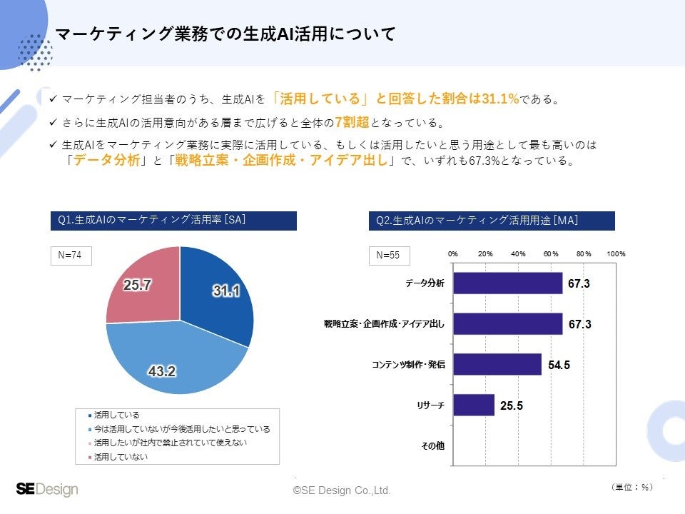 「Q1.生成AIをマーケティング業務に活用していますか。 当てはまるものをお知らせください。 (単一回答)」(n=74)と質問したところ、「活用している」と回答した割合は31.1%でしたが、活用意向がある層まで広げると全体の7割以上が生成AIの活用意欲を示していました。