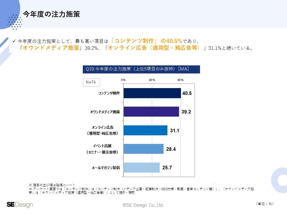 「Q10.今年度実施予定、もしくは実施中の施策の中で、注力している、する予定の施策を3つまで選んでお知らせください。(複数回答)」(n=74)と質問したところ、「コンテンツ制作(ホワイトペーパー・導入事例等)」という回答が最も多く、40.5%でした。