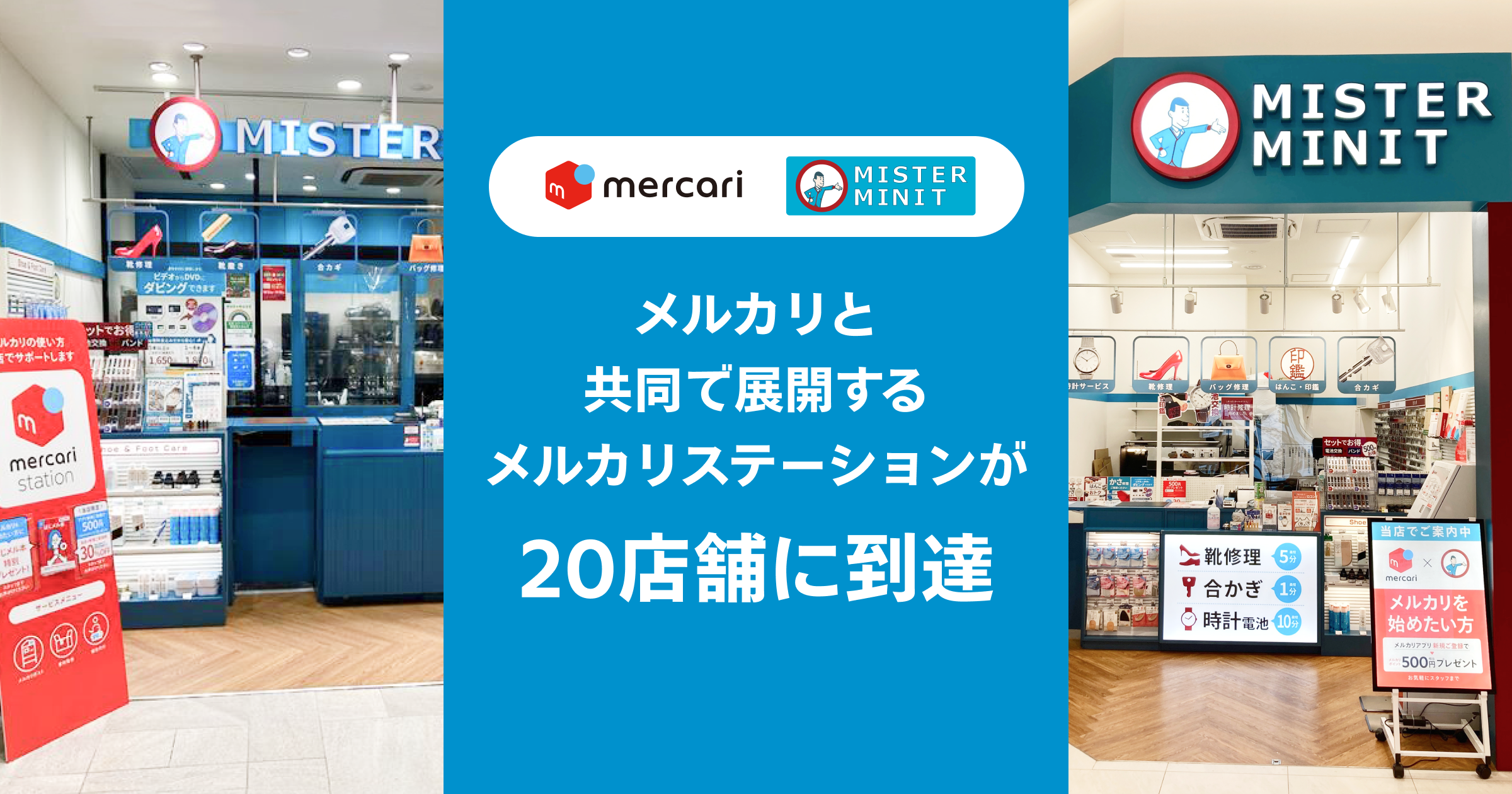 靴修理サービスチェーン店「ミスターミニット」を展開するミニット・アジア・パシフィック株式会社(以下、ミスターミニット)は、株式会社メルカリ(以下、メルカリ)と共同で展開する「メルカリステーション」が11月16日(水)に、20店舗に到達したことをお知らせいたします。
