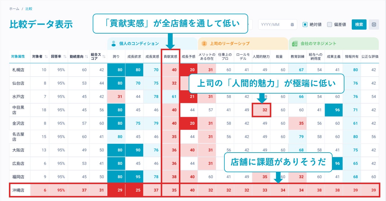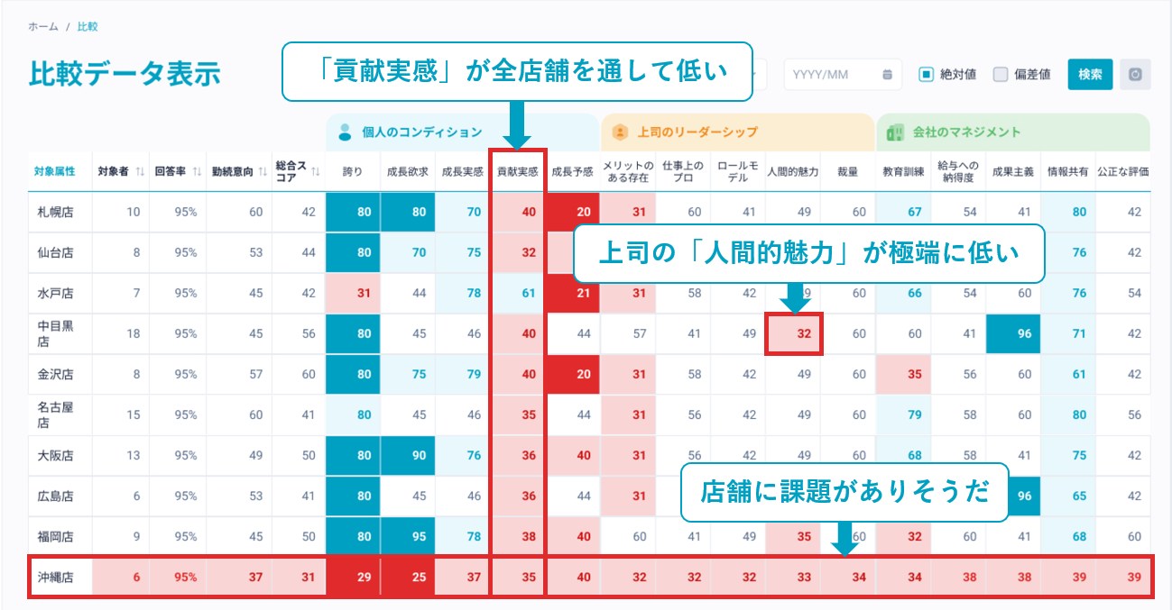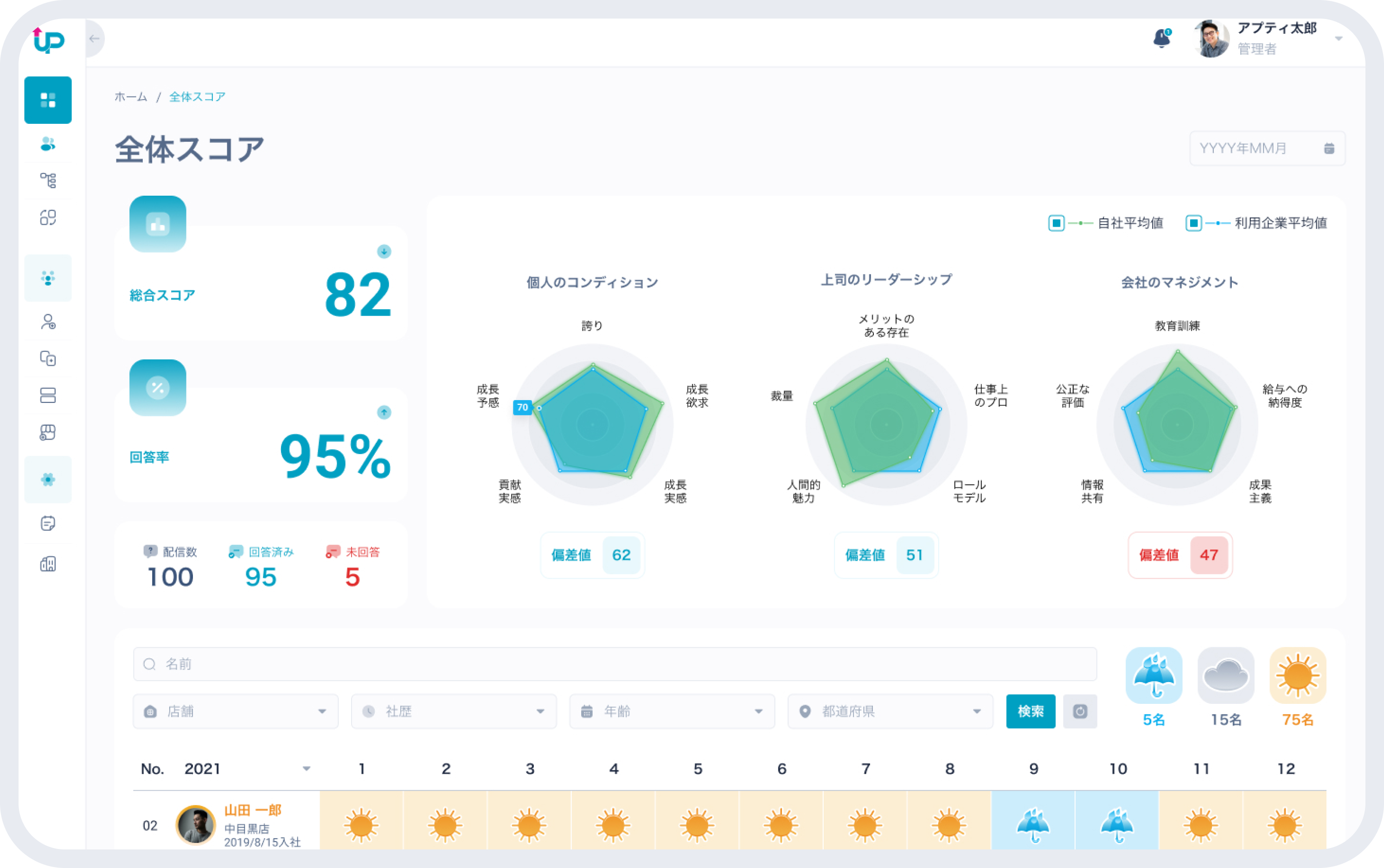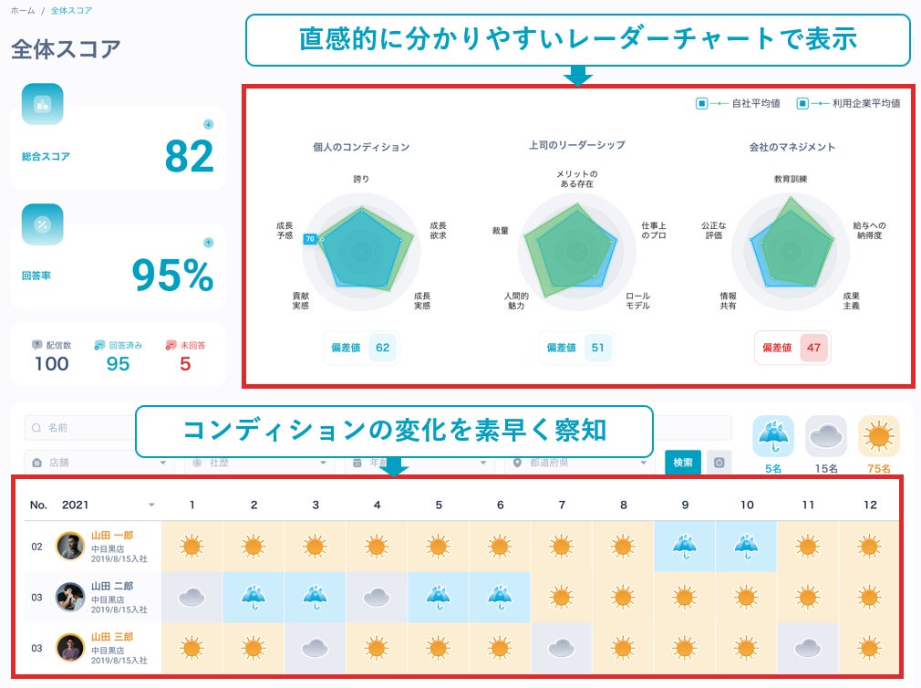 直感的に分かりやすいデザインで店舗・個人の状態を見える化しコンディションの変化を素早く察知することができます。