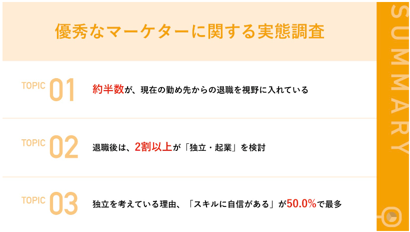 【年収800万円以上のマーケターに調査】優秀な正社員マーケターの約半数が退職を検討 2割以上が「独立・起業」の意向