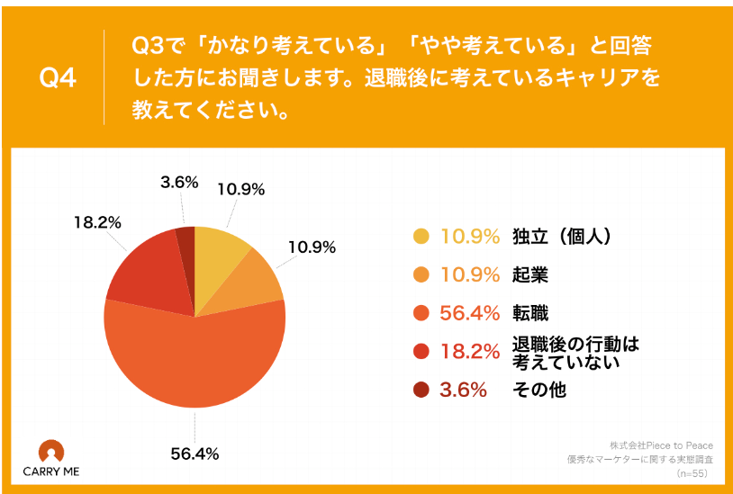 Q3で「かなり考えている」「やや考えている」と回答した方に、「Q4.退職後に考えているキャリアを教えてください。」(n=55)と質問したところ、「独立(個人)」が10.9%、「起業」が10.9%という回答となりました。