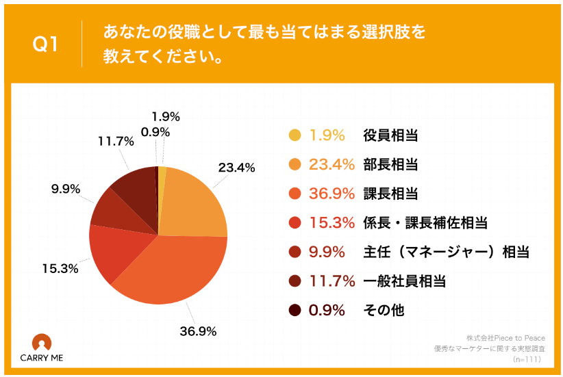 「Q1.あなたの役職として最も当てはまる選択肢を教えてください。」(n=111)と質問したところ、「課長相当」が36.9%、「部長相当」が23.4%という回答となりました。
