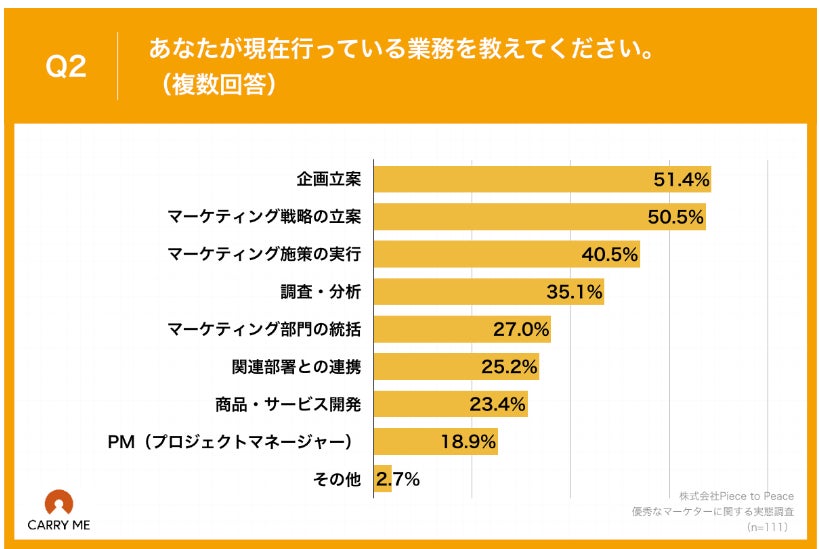 「Q2.あなたが現在行っている業務を教えてください。(複数回答)」(n=111)と質問したところ、「企画立案」が51.4%、「マーケティング戦略の立案」が50.5%、「マーケティング施策の実行」が40.5%という回答となりました。