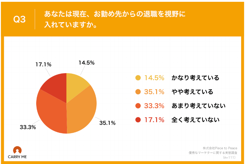 「Q3.あなたは現在、お勤め先からの退職を視野に入れていますか。」(n=111)と質問したところ、「かなり考えている」が14.5%、「やや考えている」が35.1%という回答となりました。