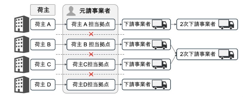 プラットフォームにトラックの稼働が空いているかの情報を集約し、対応可能なトラックを可視化。荷主や元請けが見られるようにすると、運べるトラックが目視でわかり配送効率化につながります。国交省でも多重下請け構造を問題視して、2次受けまでという制限で法改正に動いています。プラットフォームで可視化できれば、信頼性のある企業を介して今まで直接取引のなかった荷主と運送会社を繋げられ、多重下請けの課題解消に向けて一役を担うでしょう。