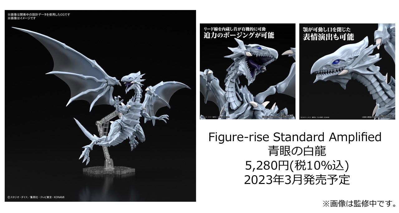 『遊☆戯☆王デュエルモンスターズ』屈指の人気モンスター「青眼の白龍」が当社オリジナルブランドである“Figure-rise Standard Amplified”シリーズから遂に登場。Figure-rise Standard Amplifiedシリーズとは、原作リスペクトのもとキャラクターの持つ魅力を“増幅”させたプラモデルオリジナルのデザインのブランドです。翼膜にはグラデーション印刷を施された軟質素材を採用し、躍動感あふれる両翼を再現。首と尾は節に合わせたパーツ分割やリード線を活用させることでしなやかな動きを実現しているプラモデルとなります。