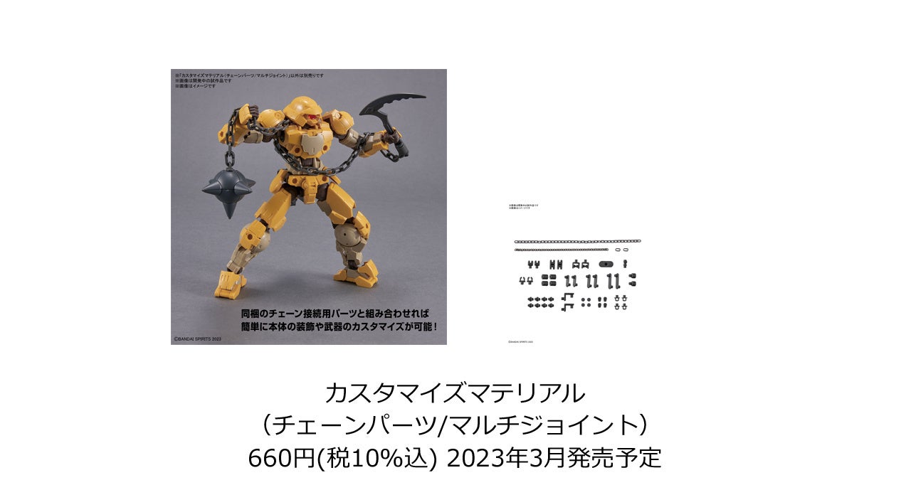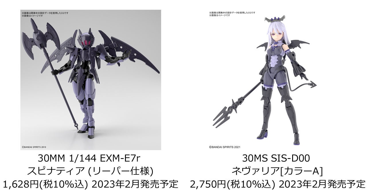 30MMからは新機体「30MM 1/144 EXM-E7r スピナティア (リーパー仕様)」が登場!素体となる本体のほか、リーパー仕様ならではのアーマーパーツ、武器パーツがひとつになったオールインワンアイテム、このほかにも人気のオプションパーツセットの新商品も登場します。30MSからも新素体「30MS SIS-D00 ネヴァリア[カラーA]」が登場!素体に加え、3種のフェイスパーツ、アーマーパーツ、ハンドパーツがひとつになり、この1商品で“悪魔的な”可愛らしさを演出できます!このほかにもオプションパーツセットやヘアパーツも登場し、さらなるカスタマイズを楽しめます。