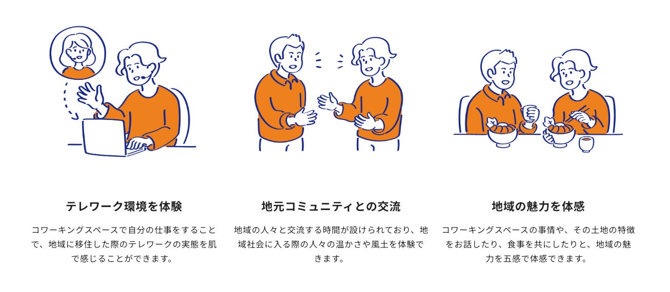 和歌山県では、そのような方達に向けて、1泊2日〜2泊3日の間、県内のコワーキングスペースで、テレワークを行っていただく「テレワーク体験コース」をご用意しました。期間中には、地域の方々と交流していただけます。