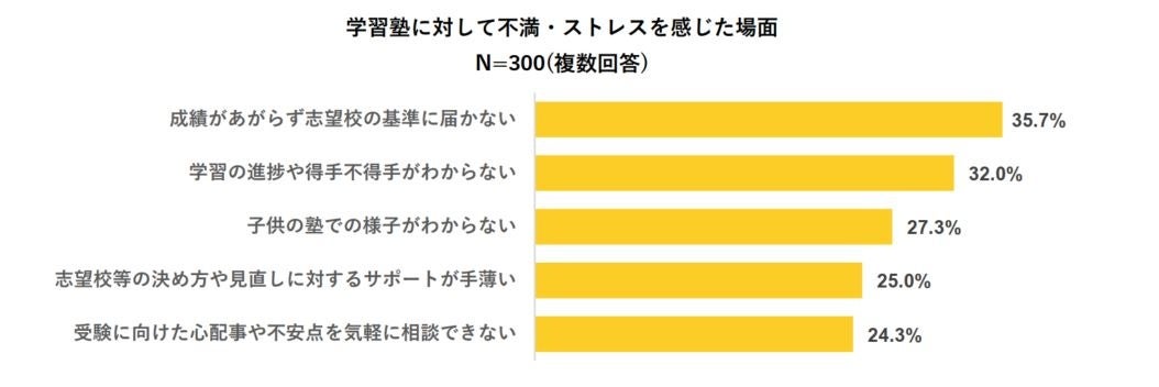 ・学習塾への不満として、成績だけでなく、3人に1人が学習の進捗がわからないことにストレスを抱えていることがわかった。