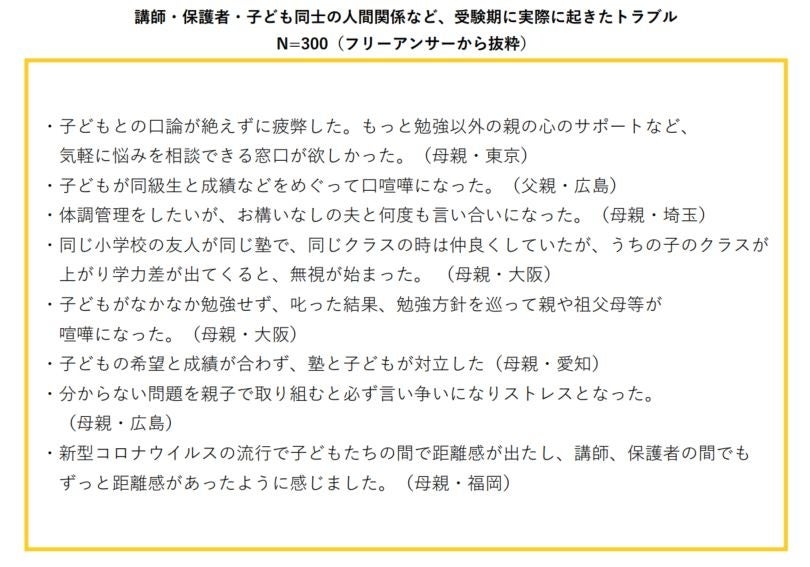 ・受験期間中の家族間、子ども間での衝突が多いという声が多数上がった。