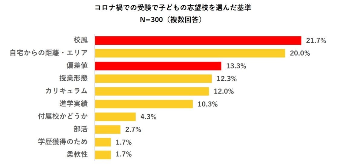 - コロナ禍の受験における志望校選びのポイント。偏差値を上回り「校風(21.7%)」が1位にランクイン