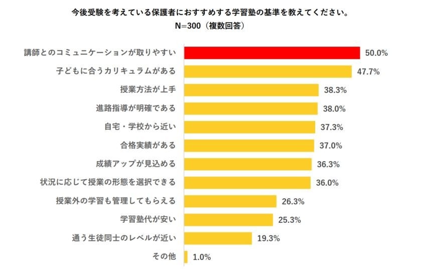 - 来年度受験の保護者におすすめする学習塾選びのポイント。半数以上が「講師とのコミュニケーションの取りやすさ(50.0%)」と回答し1位に
