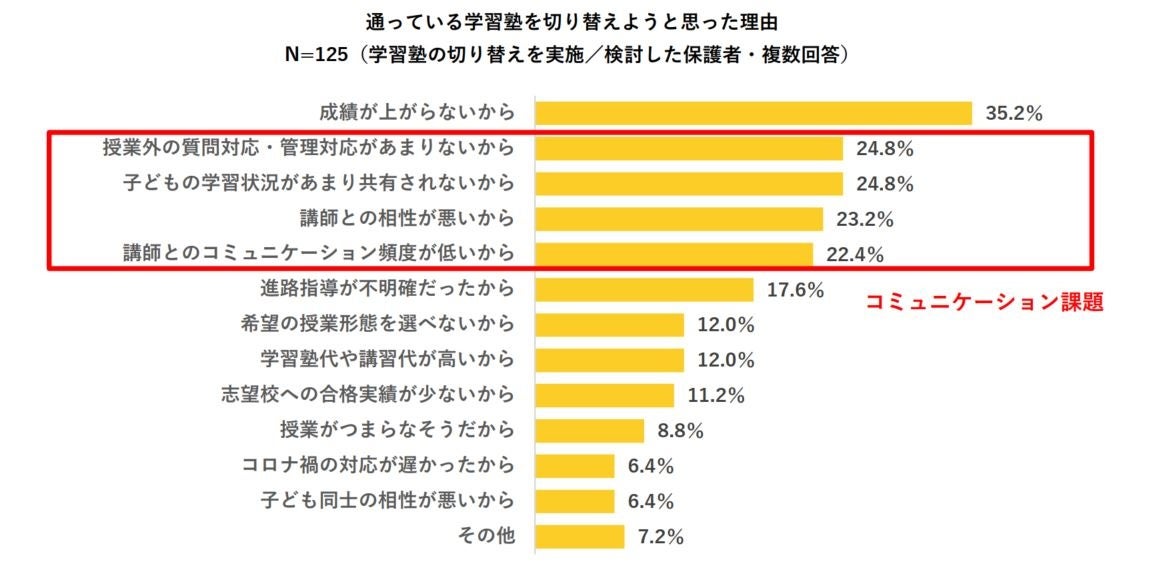 - 塾の切り替えを実施/検討する理由として「成績が上がらないから」が最も多く3割以上が回答。続く4項目を「コミュニケーション課題」が独占