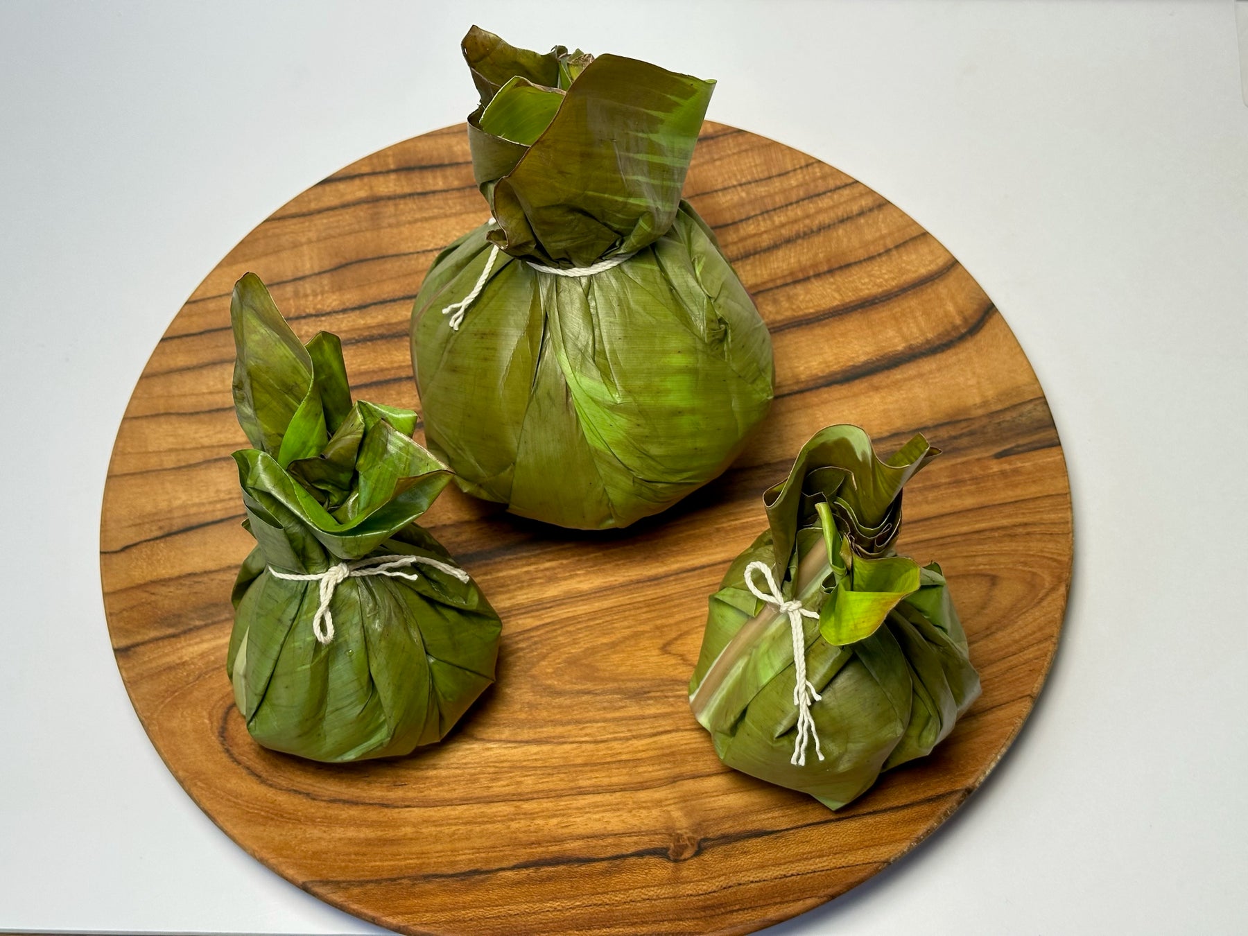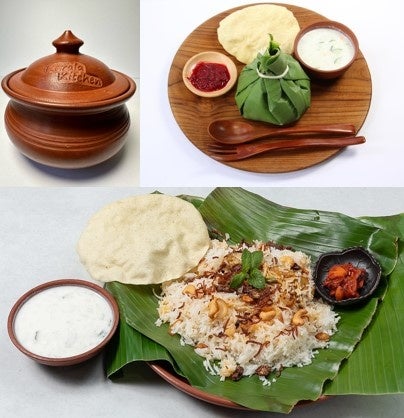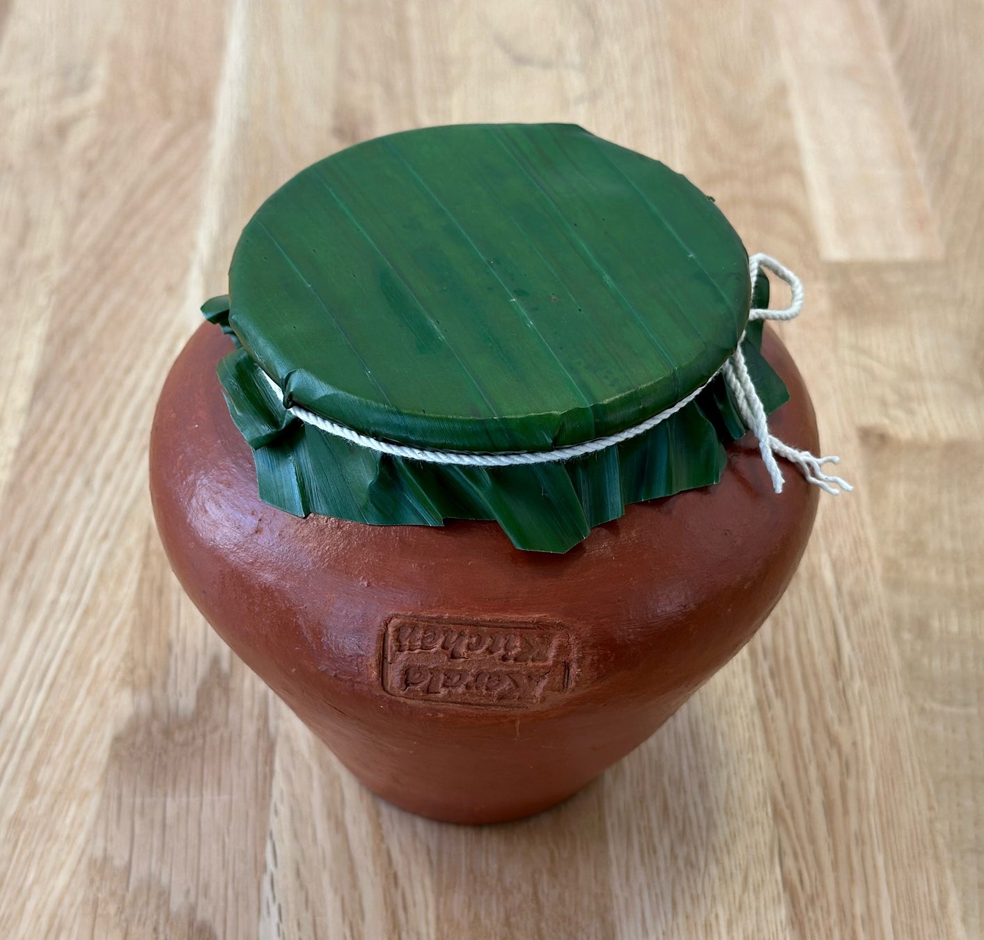 ケララ キッチンオリジナルの素焼きのポット(壺)でご提供するスタイルかバナナのリーフで結んで蒸した”キリ“でご提供するスタイル、どちらかお選びいただけます。