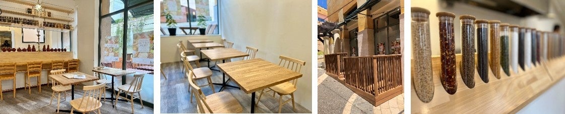 木の温もりを感じる洗練された店内には、料理の調理工程が見えるカウンターや人数に合わせてご利用いただけるテーブル席が並び、外にはテラス席もご用意しております。キッチンカウンターに並ぶ約40種類ものスパイスは、調理で使用する他、今後お客様への量り売り販売もスタートする予定です。