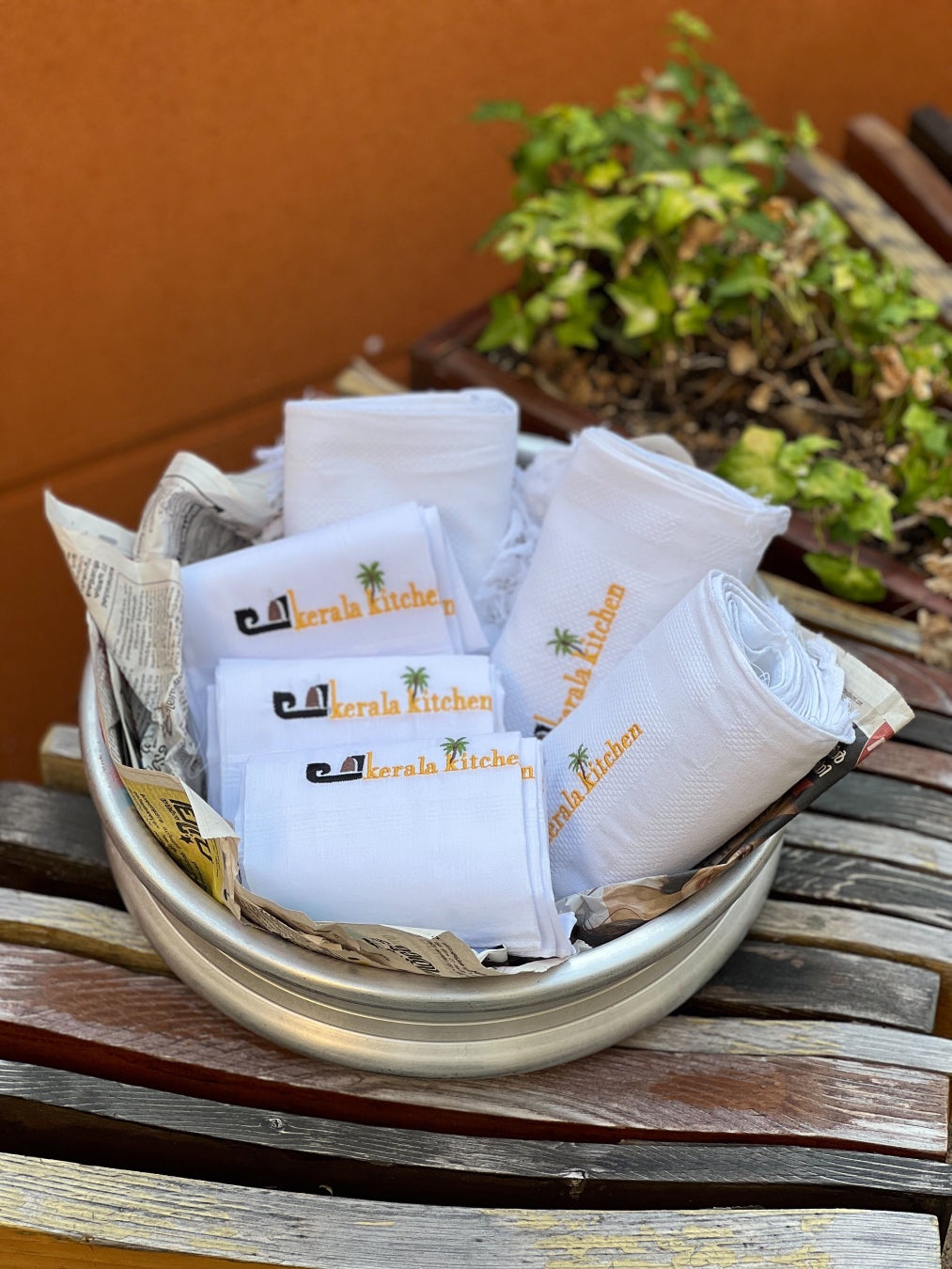 今回オープンを記念して、お食事¥2,200(税込)以上で、本場ケララで織られた「Kerala Kitchen」ロゴ刺繍入りのオリジナルクロスorハンカチを数量限定でプレゼントいたします。ぜひこの機会にご来店ください。