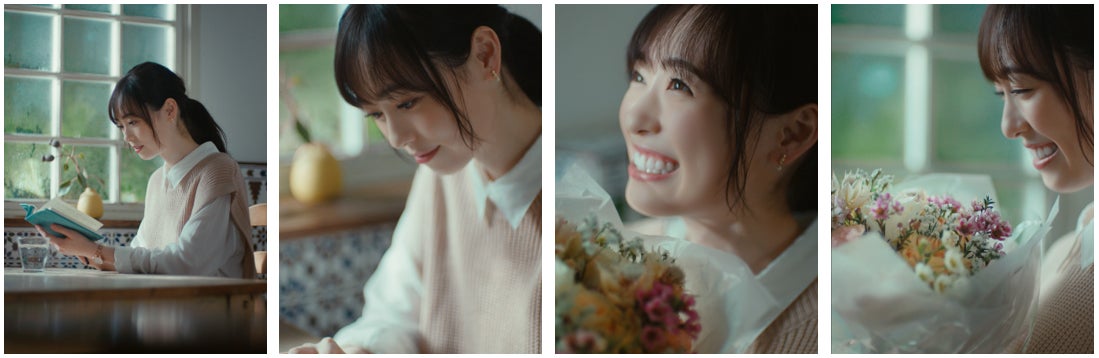 本を読みながら、待ち合わせの相手が来るのを楽しみに待っている福原さん。そこに現れた男性の手には綺麗な花束が。「いつもありがとう」とサプライズで花束をプレゼントされ、驚きながら受け取ります。「ほんとうに幸せなとき。きれいな笑顔なんて、する余裕ないよ」と喜び、満面の笑みを浮かべます。照れた表情で花束に目を向け、上目遣いで彼を見つめるのでした。