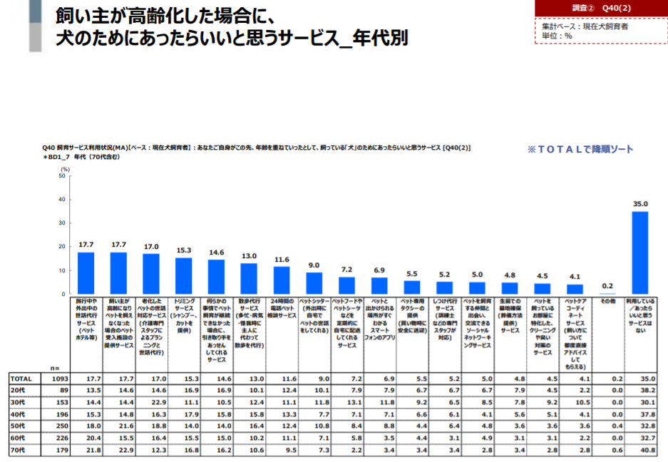 またペットだけでなく飼い主の高齢化によって、ペットの世話をする身体的負担もあり、「飼い主が高齢化した場合に、犬のためにあったらいいと思うサービス」においては第1位に「旅行中や外出中の世話代行サービス(ペットホテル等)」(17.7%)、第3位に「老化したペットの世話対応サービス(介護専門スタッフによるプランニングと世話代行)」(17%)がランクインし、ペットシッターサービス市場は今後さらに拡大していくことが考えられます。