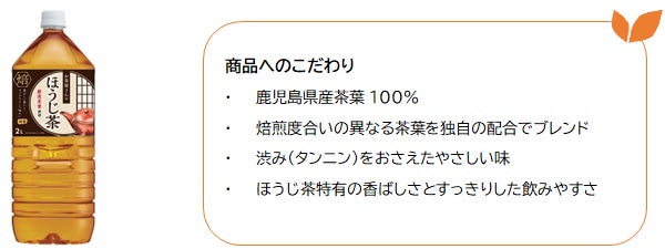 「お茶屋さんシリーズ」は年間約4億本(*1)の清涼飲料を製造・販売する当社のオリジナルブランドです。「お茶屋さんのほうじ茶」は鹿児島県産茶葉を100%使用し、焙煎度合いの異なる茶葉を独自の配合でブレンドすることにより、ほうじ茶特有の香ばしさとすっきりした飲みやすさの両立を実現しています。「お茶屋さんのほうじ茶」でほっと安らぐひとときをお過ごしください。