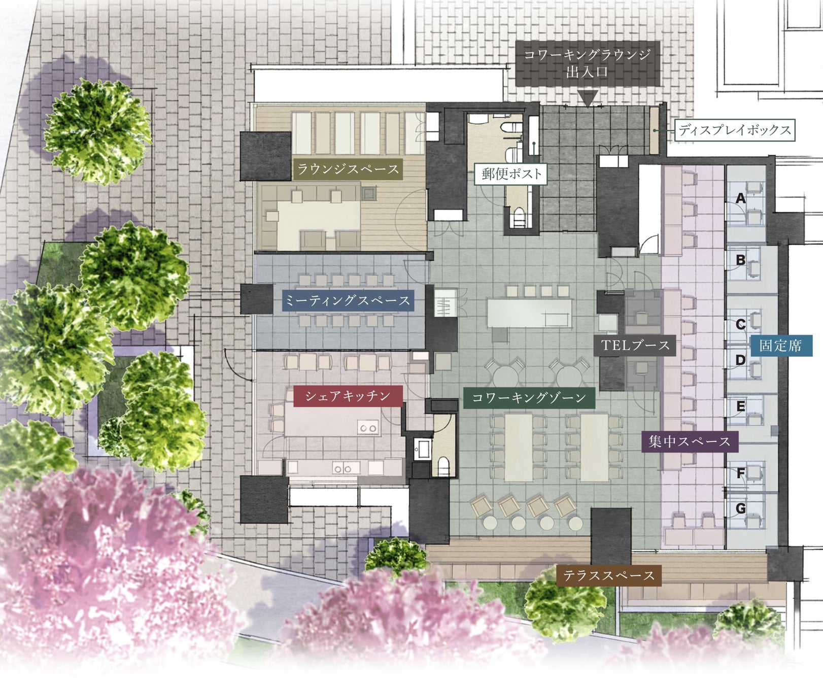 ・「コワーキングラウンジ」の中心には、神田川沿いの桜を臨める席や4人掛けや8人掛けの「大型テーブル席」を用意。さらにパーテーションで仕切られた「集中スペース」や月単位で自分専用の書斎として使える「個室スペース」、TV会議にも使える「電話ブース」等利用シーンに合わせて使い分けが可能としています。