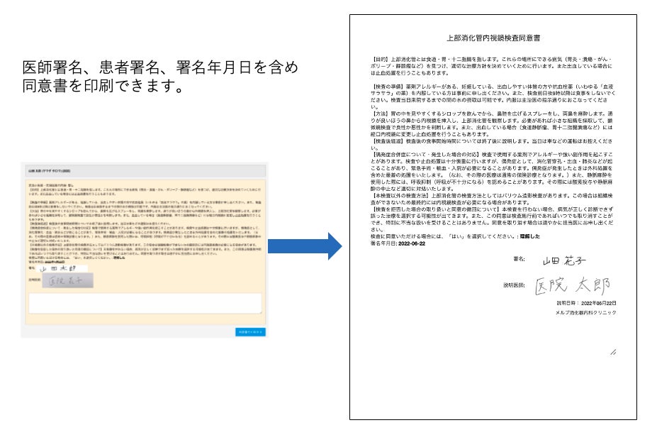 その中で、問診票の記入と並行して患者さんに検査や手術前には同意書に署名を求める場面が多くあることから、内視鏡検査を実施する割合が多い内科・消化器科のクリニックを中心に、電子的な同意書機能の開発要望を多く頂きました。