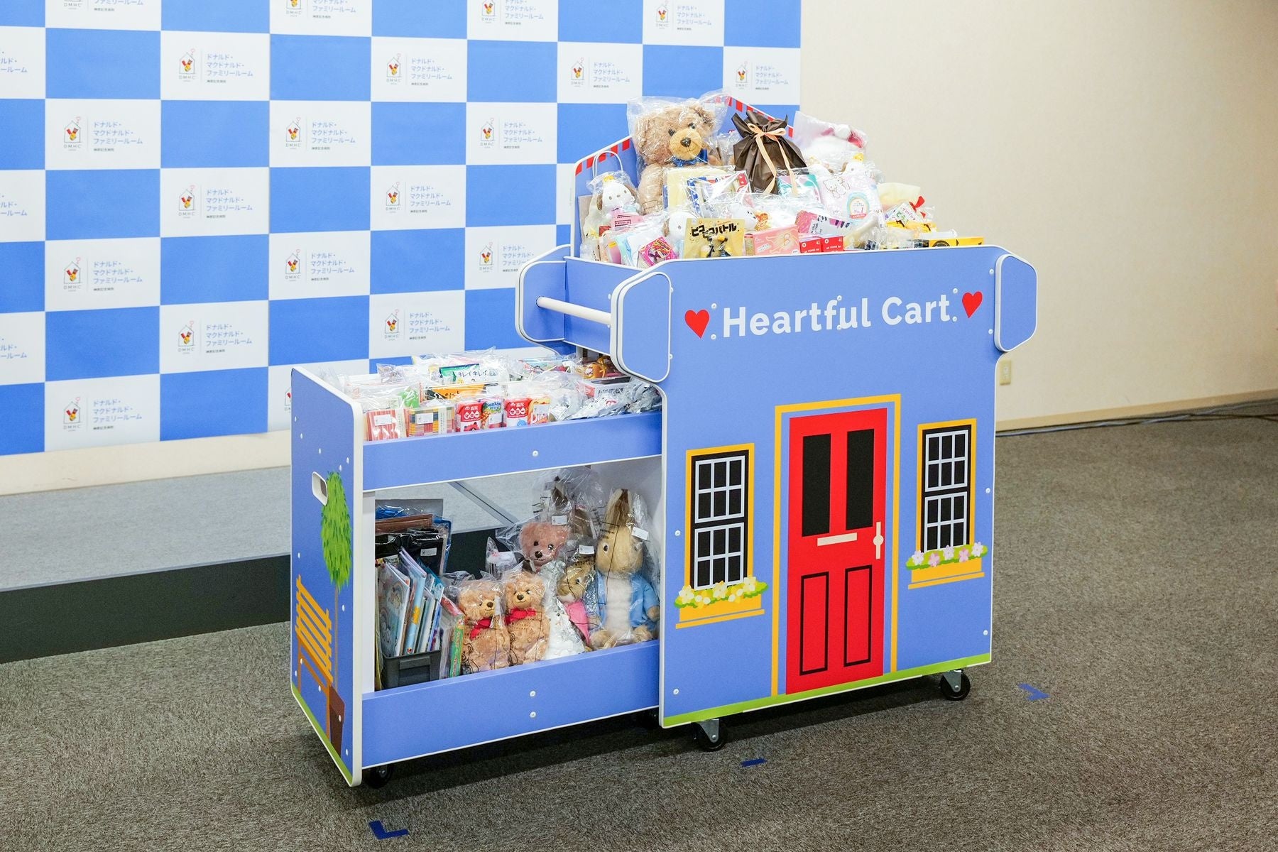 DMHCでは、ハウスやファミリールームの建設・運営だけではなく、入院・通院している子どもたちのQOL を向上させ、病気の子どもたちに笑顔を届けることを目的とした、シェア・ハート・フォー・シック・キッズ事業を展開しています。この事業の1つとして2020 年より開始した「ハートフルカート」は、入院中の子どもたちとそのご家族をサポートするため、日用品やおもちゃなどの「ちいさなギフト」を病棟にて無償で配布する活動です。ハートフルカートには、主に入院中の子どもたちが必要とする「文房具」「おもちゃ」「日用品」「絵本」や、付き添いご家族が必要とする化粧品などの「アメニティ」を載せて配布しています。現在15 か所の連携医療機関にカートが導入されており、このたび榊原記念病院にも導入が決定。2024年12月より稼働しています。