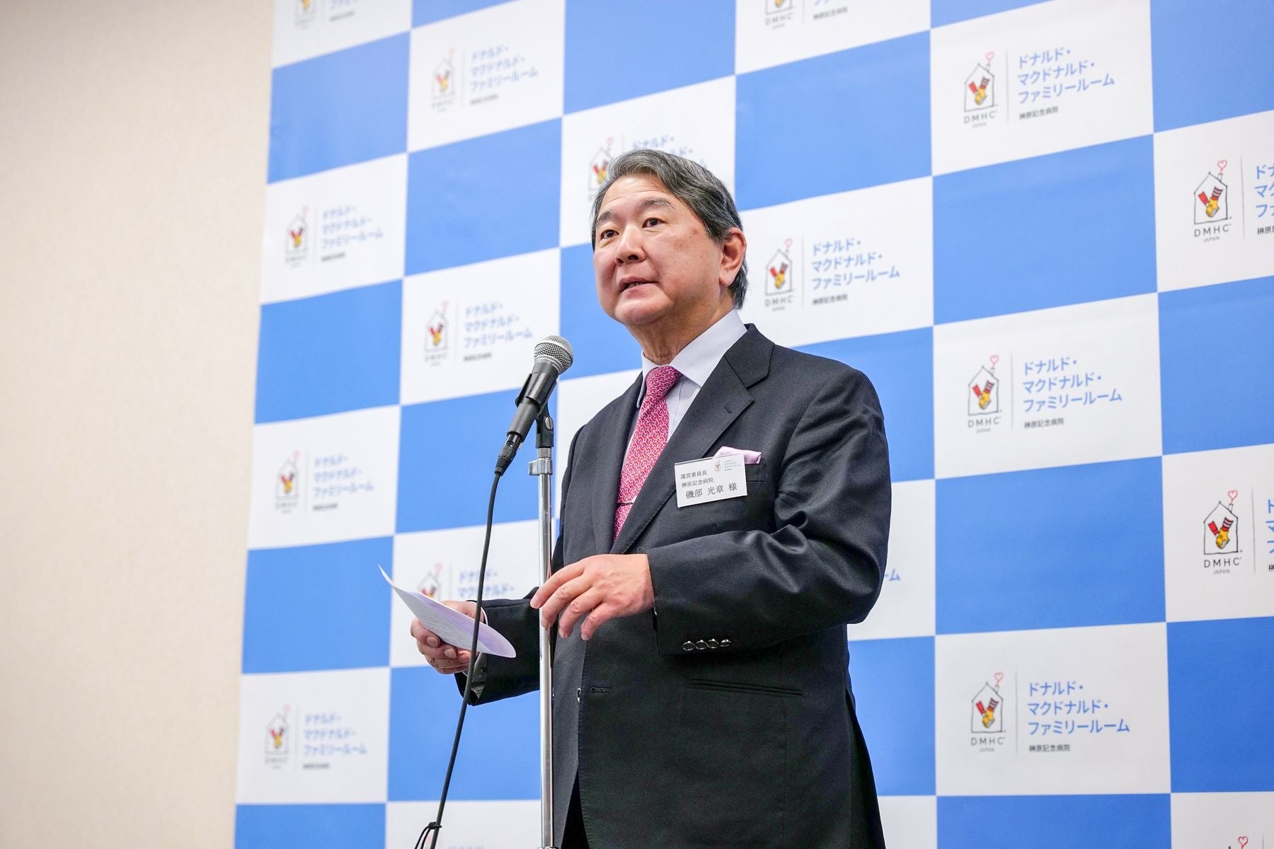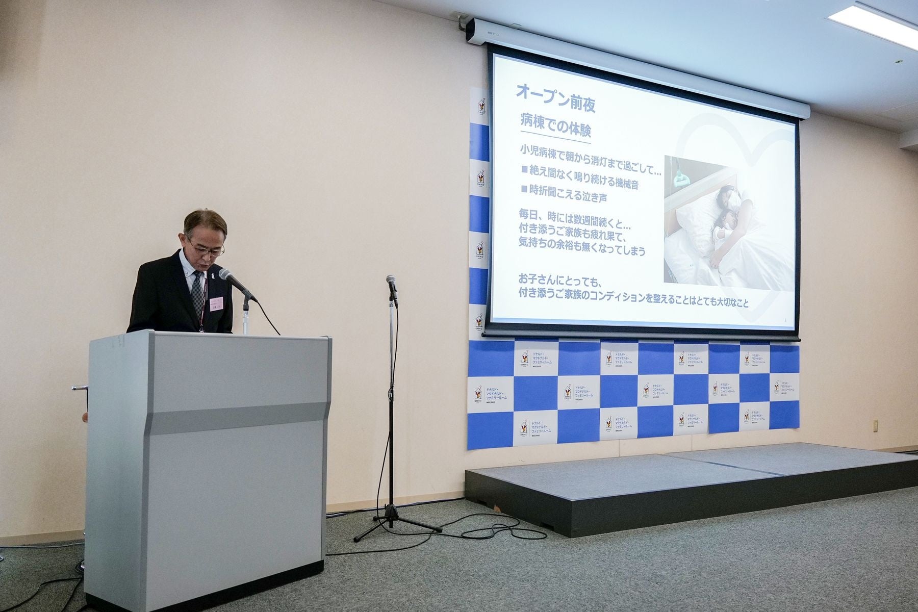 榊原記念病院の磯部院長が、関係者やボランティアへの謝辞を述べるとともに、日本第一号の「ドナルド・マクドナルド・ファミリールーム」を開設した背景や意義を伝えました。同施設がご家族の心と身体の休息場所としてうまく機能していることにも触れ、「私たちの活動を成功させることで、ファミリールームが全国に広がり、患者さんやご家族の幸せ、ひいては温かい社会づくりに貢献していきたい」と、今後の決意を語りました。