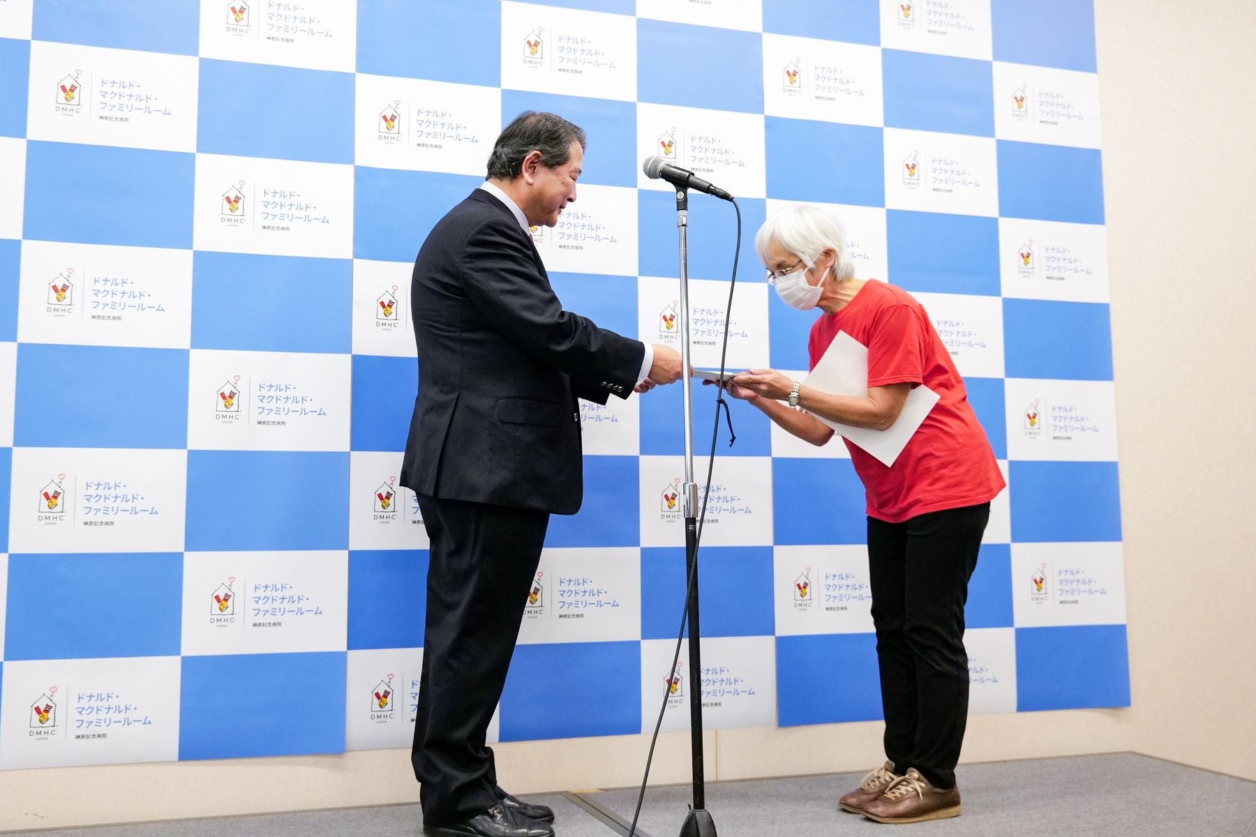 ファミリールームの運営を支えるボランティアスタッフへの感謝をお伝えすべく、榊原記念病院の磯部院長から感謝状と記念品を贈呈しました。ボランティア代表として登壇された吉野昌子さんは、「こちらこそ、このような機会をいただいたことに感謝を申し上げたい。これからも利用されるご家族の“くつろぎのひと時”をサポートできるように取り組んでいきたい」と述べました。