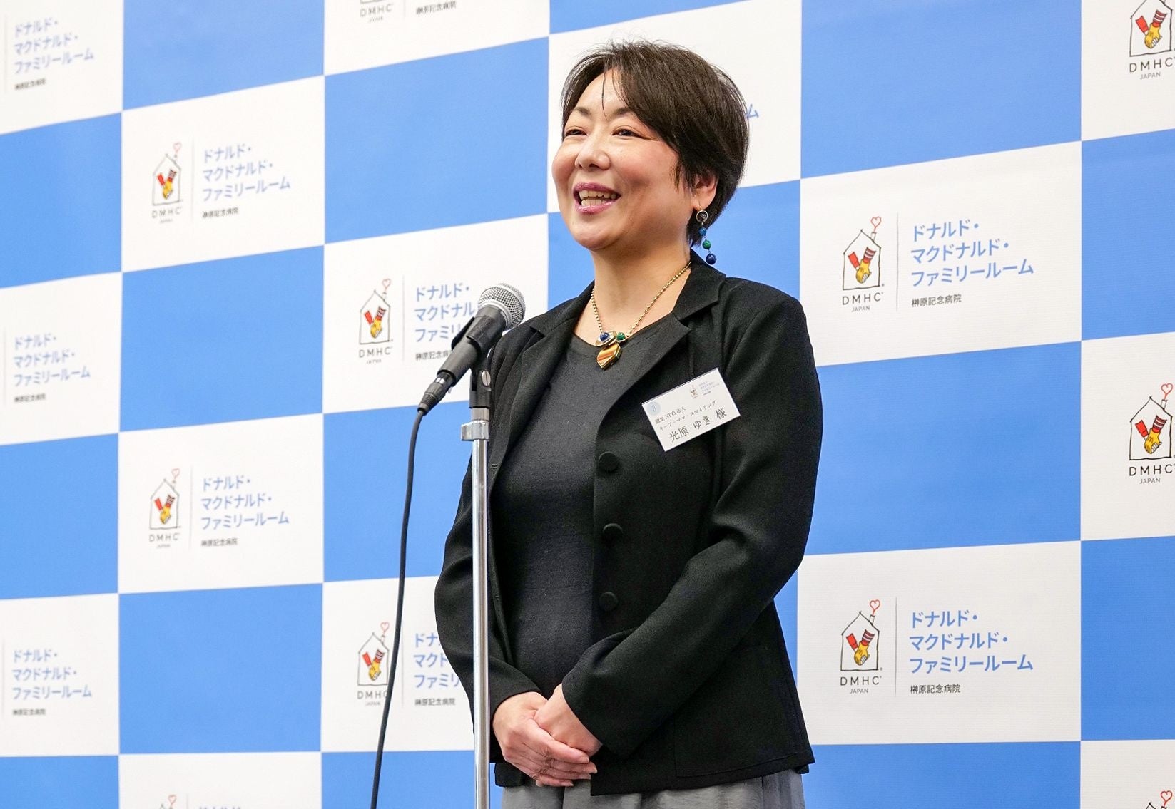 ご来賓を代表し、キープ・ママ・スマイリングの光原理事長よりご挨拶をいただきました。付き添い入院に関するご自身の体験も交えながら、「お父さんお母さんが笑顔でいることが、子どもにとって何よりの力になり、薬になる」「付き添い入院で自分を見失いそうになる中で、このファミリールームは自分を取り戻すための大切な時間・場所だと思う」とお話しくださいました。
