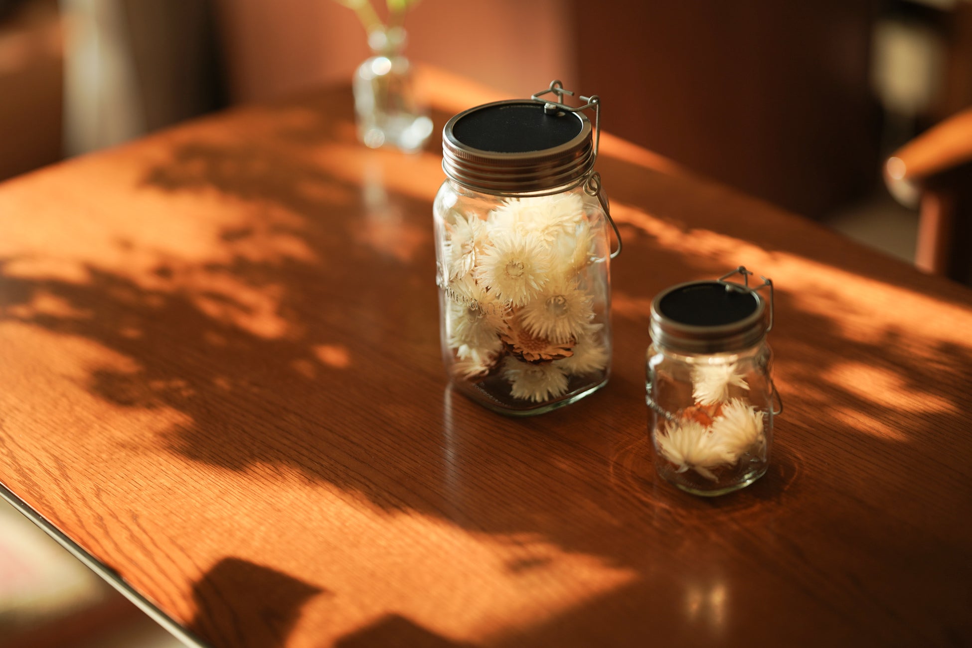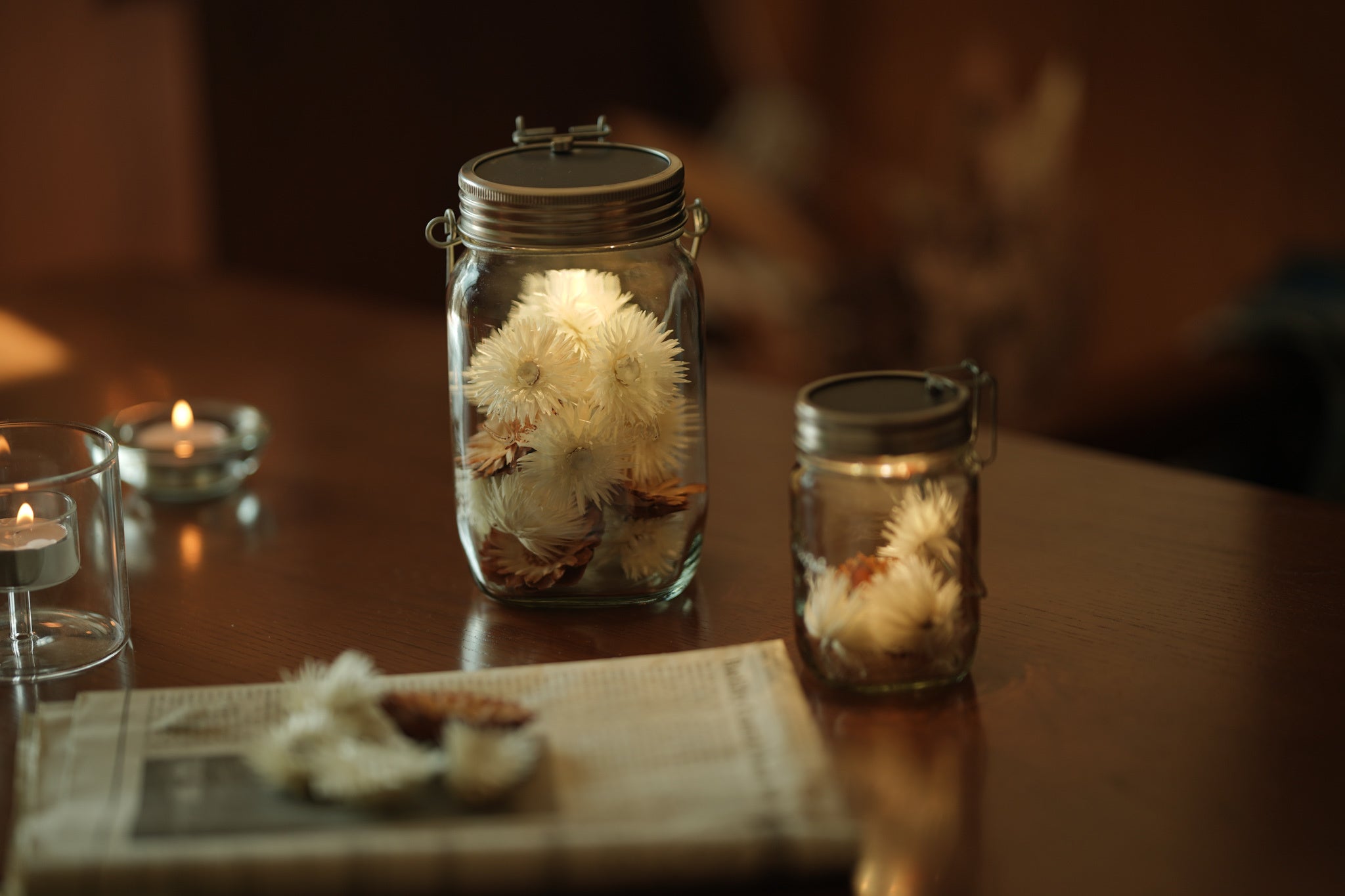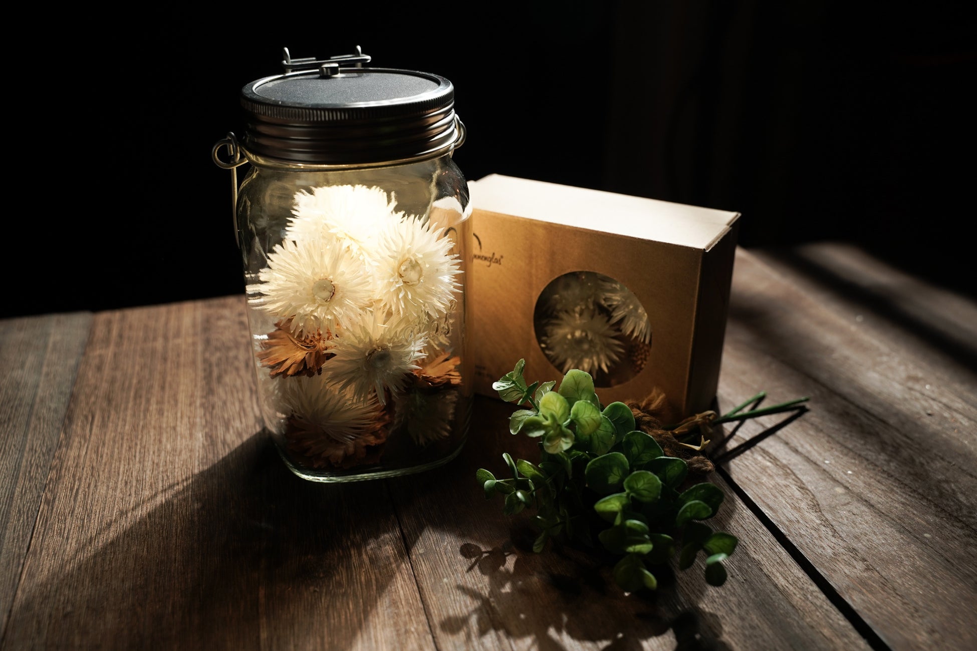 製品最大の特長は、瓶を通して広がるやさしく柔らかい光です。丈夫で耐水性に優れており、水に濡れても光源を失うことなく、24時間以上の連続発光が可能です。アウトドアシーンでの活用や、ビンの中身を自分好みにデザインできるアート性をもった製品です。