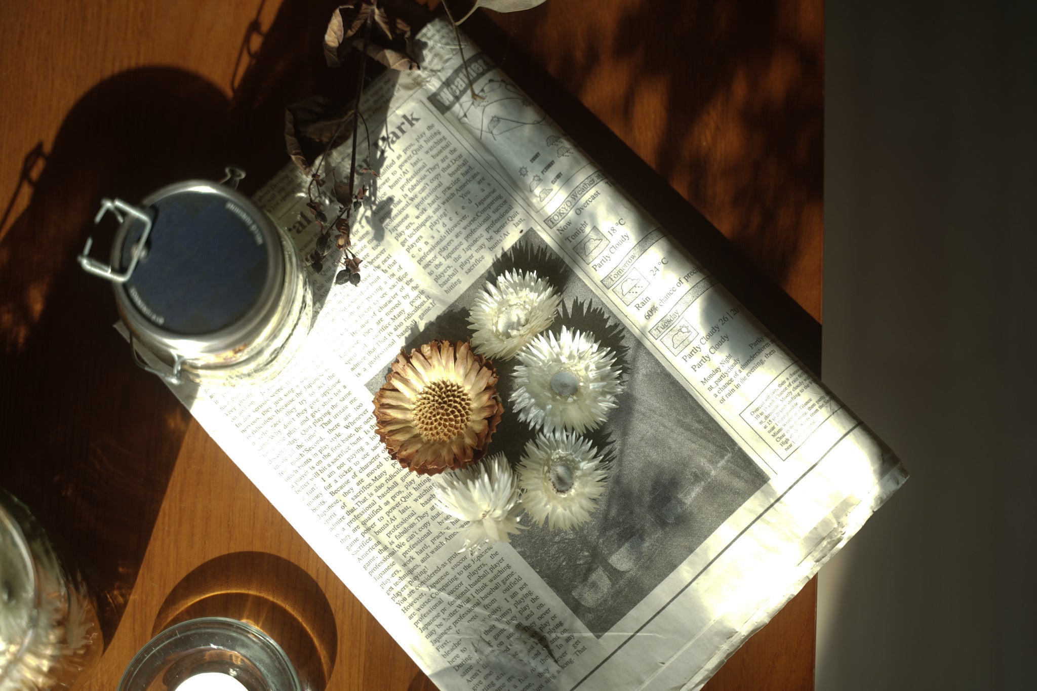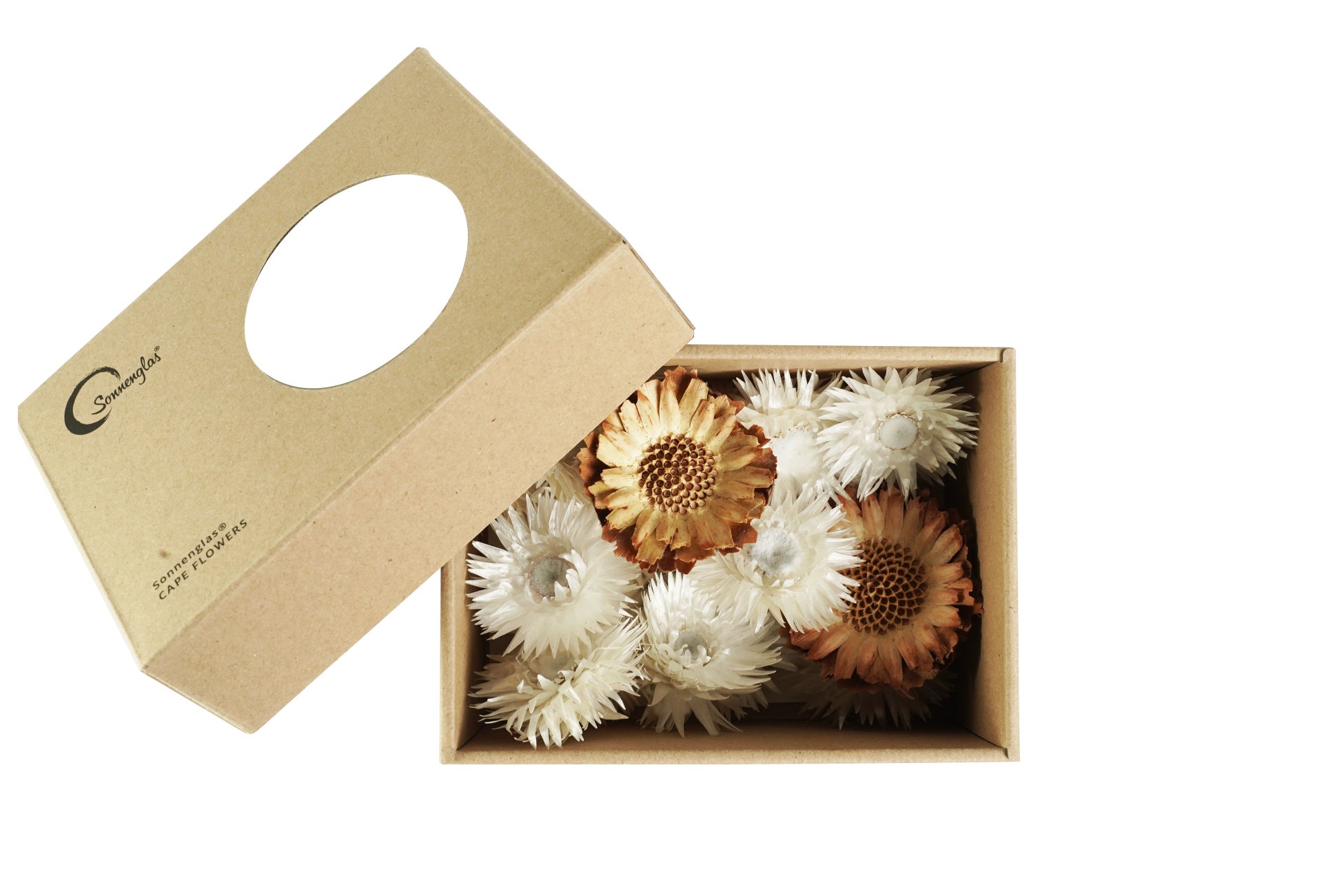 今回の新商品の主役であるコンパクタホワイトは、ベスチタ・シンカルファという南アフリカのフィンボス地方の固有種のお花で、エバーラスティング(いつまでも続く)と呼ばれています。雪の降らないケープ地方の山で、春の訪れと同時に群生して白い花を咲かせ、その様子は春の雪化粧にも例えられます。この間に摘まれ乾燥させたこのお花は、その後何年にもわたり、その形と白色を保つことから、このように呼ばれるようになりました。このエバーラスティングの呼び名を持つコンパクタホワイトを基調とし、薄い黄色のコンパクタブラウンをあしらったドライフラワーセットは、新生活を迎える方への贈り物や、ホワイトデーなどのお返しにぴったりの品です。