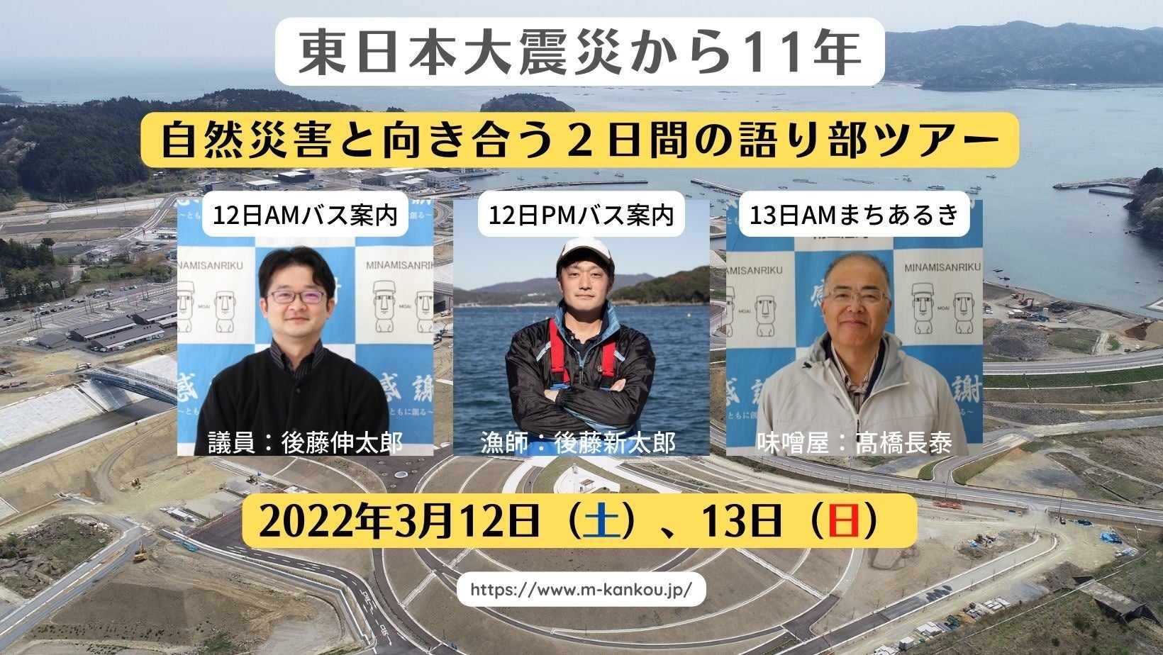 一般社団法人南三陸町観光協会(会長:及川吉則)は、3.11にあわせて震災当時の話を聴き災害への備えを考えるツアーを、2022年3月12日・13日に開催することを決定いたしました。宮城県南三陸町内の津波の浸水エリアや実際の避難道のコースを会場に、震災を語り継ぐ語り部がバスガイドやまちあるきを実施します。