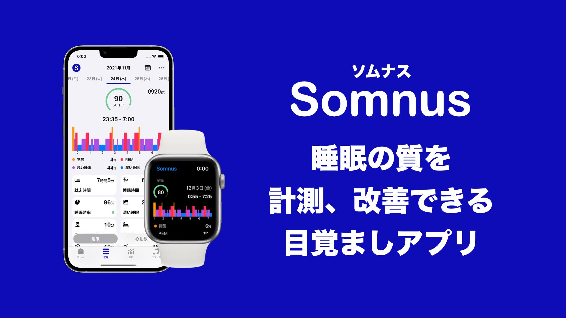 「Somnus」は、スマートフォン、Apple Watchを使用して睡眠の質やパターン、いびきを計測し、ユーザーにわかりやすく可視化するアプリです。睡眠時間、睡眠の深さ、起床時の気分などを記録・分析し、個々の睡眠習慣の改善をサポートします。シンプルな操作性と高精度なデータ分析で、幅広いユーザーに支持されています。現在アプリDL数は100万を突破し、App Storeランキング1位獲得やTVや雑誌等数多くのメディアでの紹介実績を誇ります。