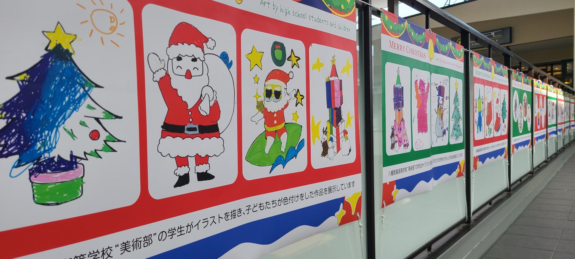 八幡商業高等学校の美術部員が描いた、サンタクロースやトナカイ、クリスマスツリーのオーナメントなどのイラストを、11月9日(土)に館内で行われたワークショップに参加した幼児~小学生の子どもたちがカラフルに色付けしました。子どもたちのイラストに、さらに八幡商業高等学校美術部員のデザインを追加して横断幕に印刷し、三井アウトレットパーク滋賀竜王南モール2階通路に、11月22日(金)~12月25日(水)の期間展示しています。